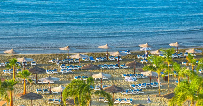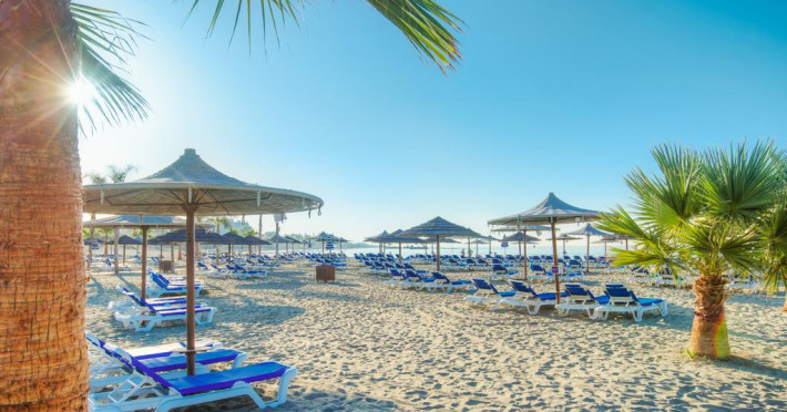 St. Raphael Resort are în apropiere o plajă cu nisip. Pe plajă există șezlonguri și umbrele de plajă.