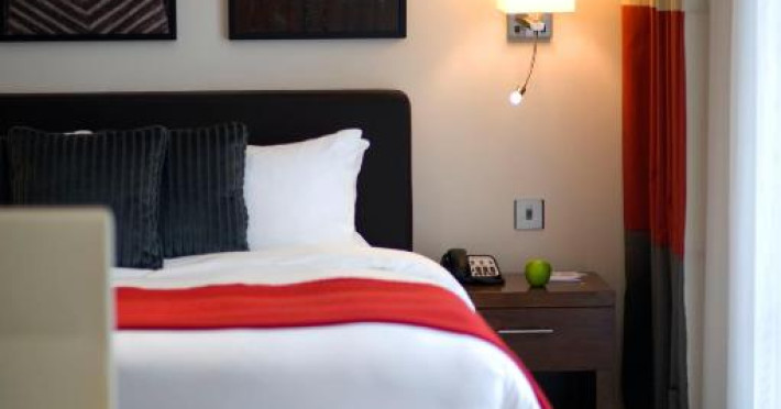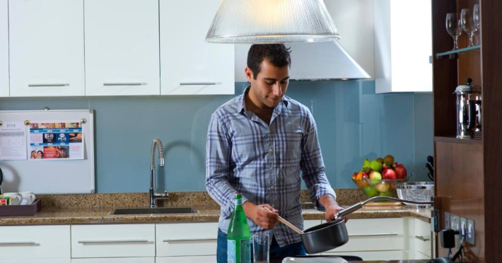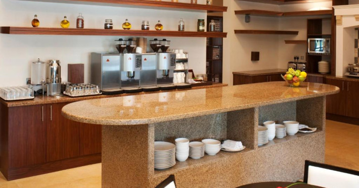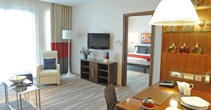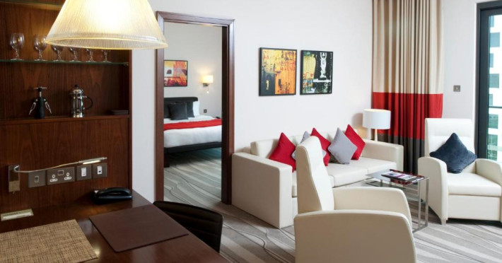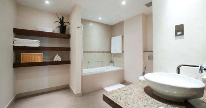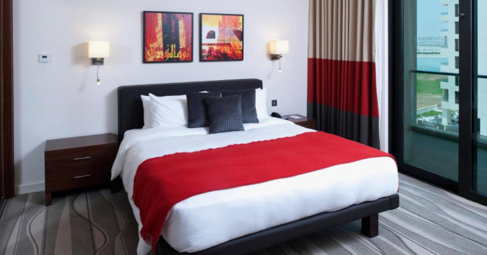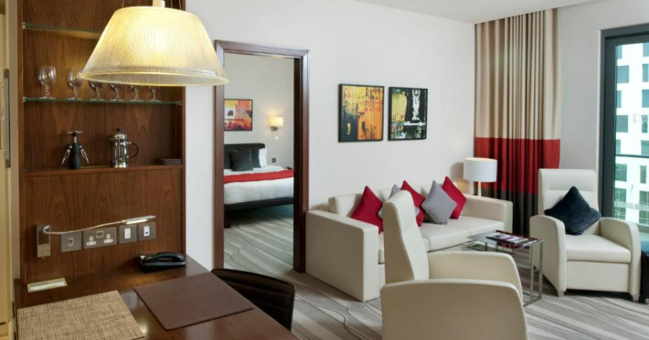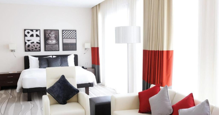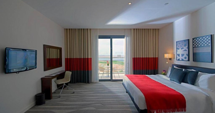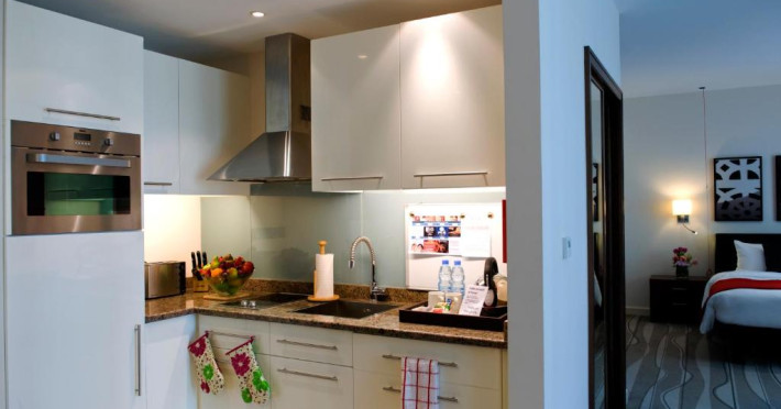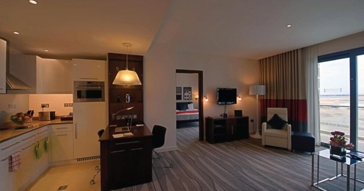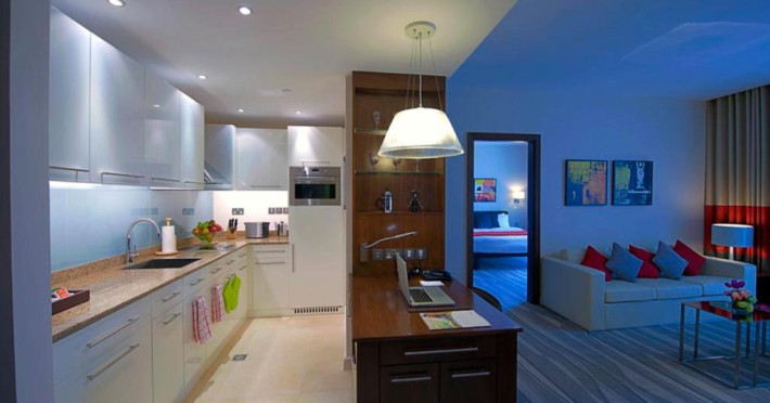 The Staybridge Yas Island’s air-conditioned accommodation has large windows and white linens on the plush beds. They all come with a fully equipped kitchen, a seating area and a 32-inch satellite LCD TV.