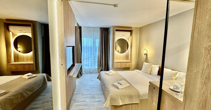 Complet modernizate in anul 2023 camerele triple au fost reconfigurate pentru a optimiza cei 15.3 mp disponibili, camerele beneficiaza de un design modern si dispun de un pat matrimonial de 140 x 200 cm, un pat single de 80x200 cm, inaltate pentru a permite optimizarea bagajelor sub acestea, de un generos LCD TV SMART de 42 inch, minibar modern, espressor de cafea, cabina de dus, uscator de par, fier de calcat, seif si WiFi.