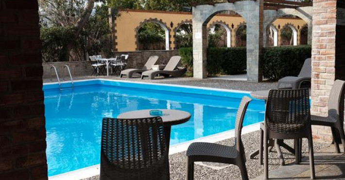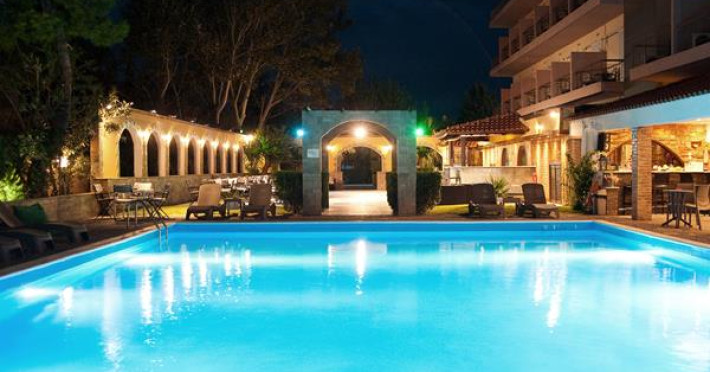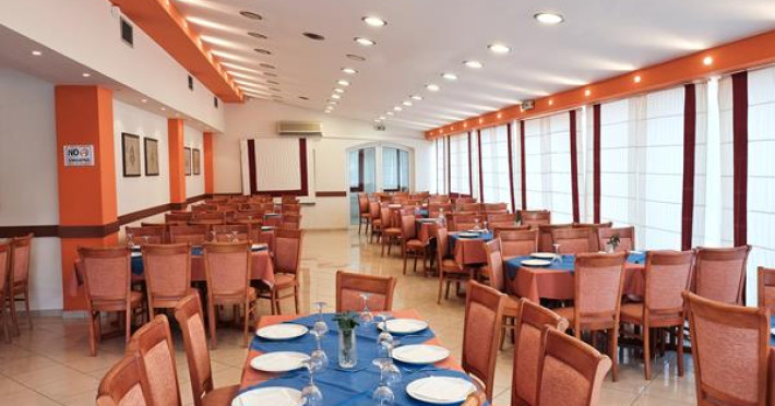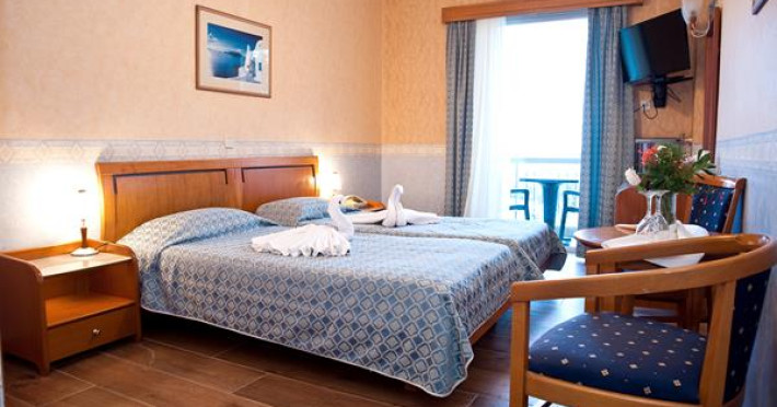 The hotel offers 86 comfortable rooms with sea view, terrace, private bathroom, TV, telephone, hairdryer, fridge, A/C and central heating. It also features a pool, restaurant, tavern, bar and pool bar, TV room and a room where the guests can play cards and chess. Ping pong, tennis, volley, basket courts and PC games are the disposal of the guests.