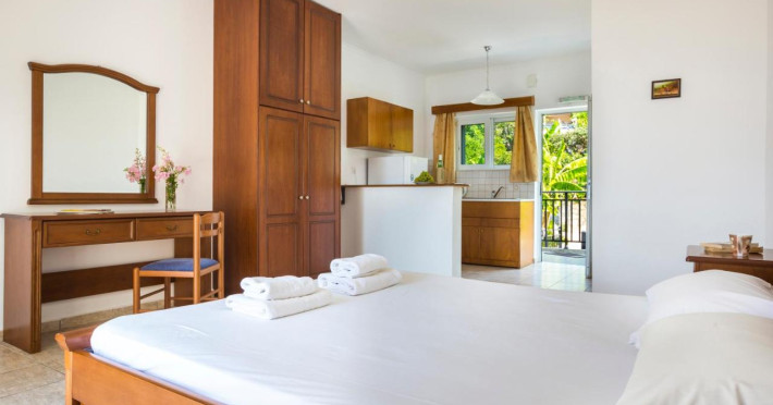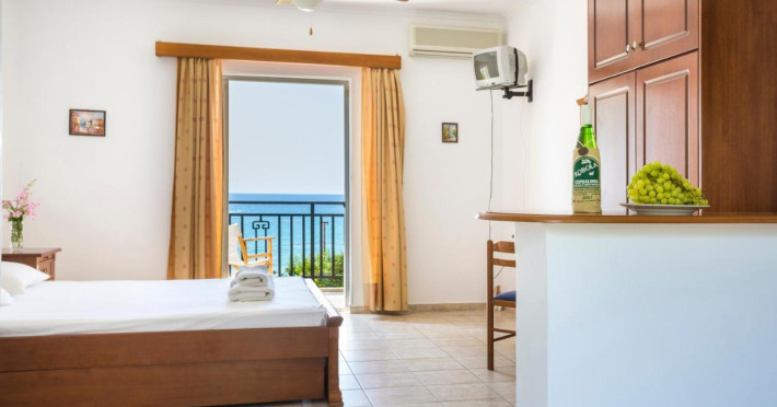 Camerele confortabile de la Stefanos Studios sunt dotate cu pardoseală de gresie/ marmură, aer condiționat și Tv. Fiecare cameră dispune de cană-fierbător. Camerele au balcon cu vedere la mare sau la grădină. În camere există baie cu duș prevăzută cu foehn. În fiecare unitate de cazare există bucătărie utilată cu frigider, plită de gătit și ustensile de bucătărie.