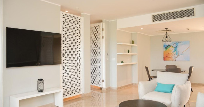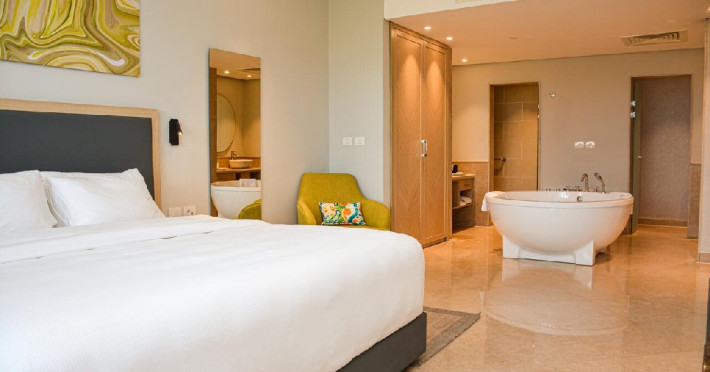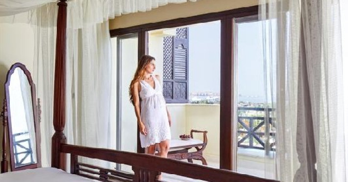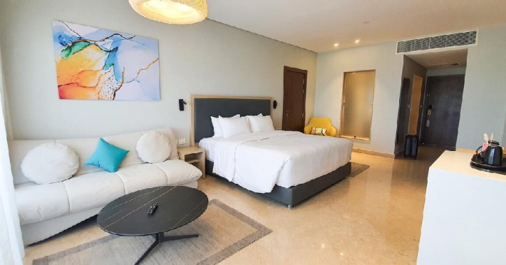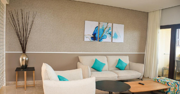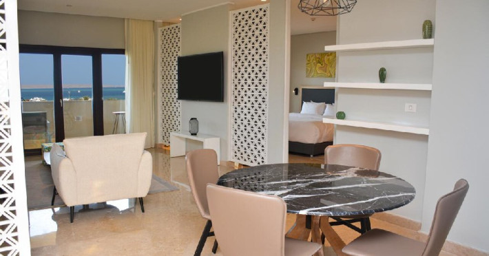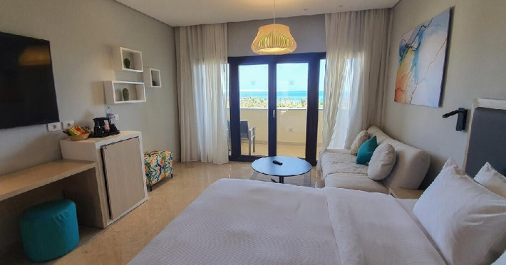 Junior Suite (74 mp, capacitatea maxima este de 2 adulti): ofera un balcon cu vedere la mare, are aer conditionat, o zona de lounge confortabila si un sezlong sau un balansoar unde oaspetii se pot relaxa.