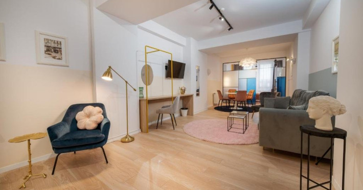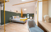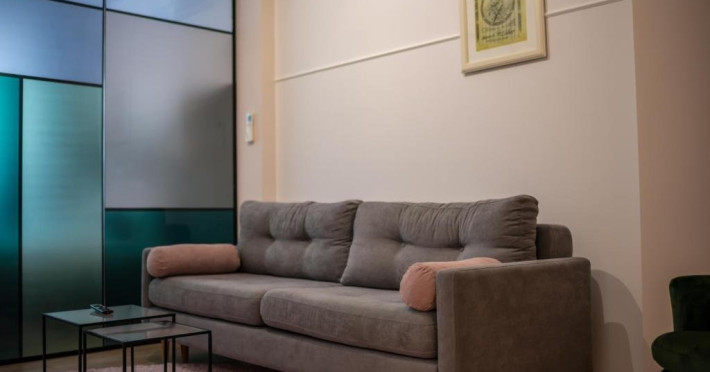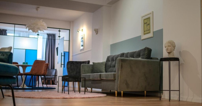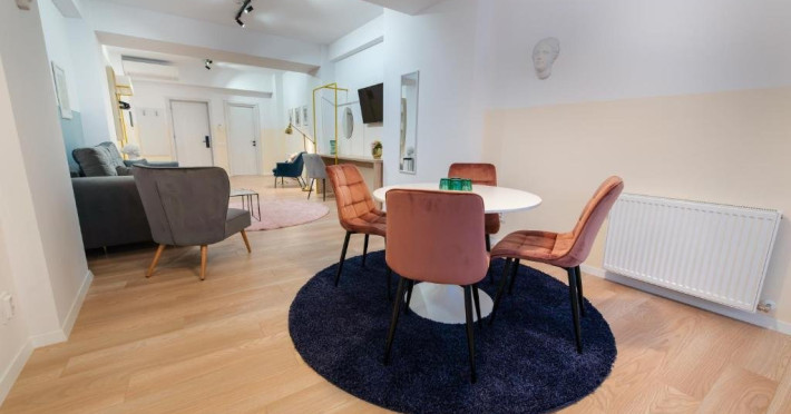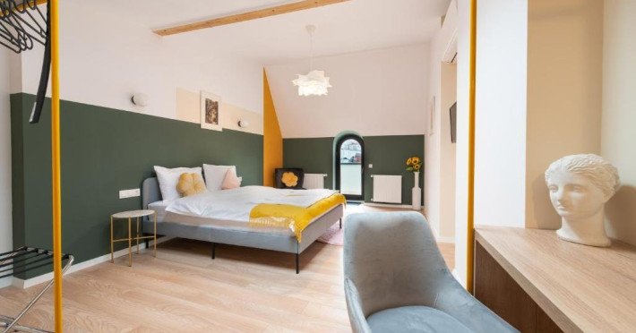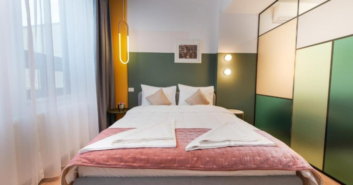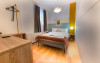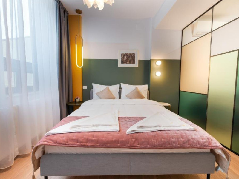 Camera este potrivita pentru 4 adulti sau pentru o familie cu 2 copii. Are o suprafata de 42 metri patrati, ceea ce ofera spatiu, iar dormitorul este despartit de zona living-ului printr-un perete de sticla.