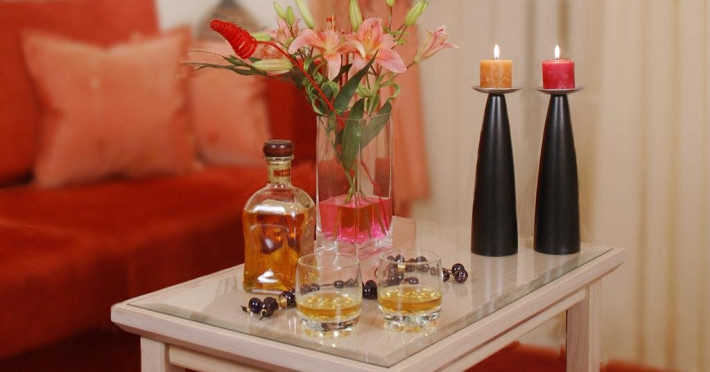 Deluxe suite este un apartament format din living si dormitor cu pat matrimonial. Livingul are semineu, TV LCD si chicineta. Baia beneficiaza de jacuzzi.
