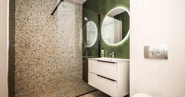 Baia moderna este dotata cu dus spatios, masina de spalat si toate accesoriile necesare, asigurand un plus de independenta si confort, mai ales pentru sejururi mai lungi.