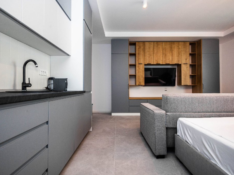 Zona de dormit este echipata cu un pat matrimonial confortabil si o canapea extensibila, oferind astfel pana la 3-4 locuri de dormit. Patul este pozitionat strategic in fata unui TV smart, ideal pentru seri linistite cu filme sau emisiuni preferate.
