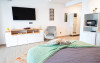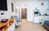 Studiourile se compun dintr-un open space , pat matrimonial (160x200) si o canapea extensibila (160x200), precum si baie cu cabina de dus cu uscator de par si obiecte de toaleta. Dispune si de terasa de 12 mp cu loc de servit masa si uscator de rufe. Suprafata 45 mp.
