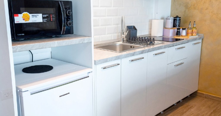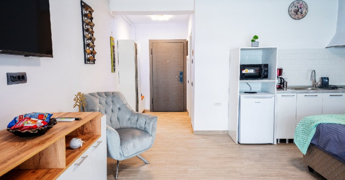Studioul este dotat cu o chicineta (bucatarie deschisa) ce ofera posibilitatea celor ce doresc sa-si prepare singuri masa. Dispune de : frigider, plita electrica, cuptor microunde, hota.
