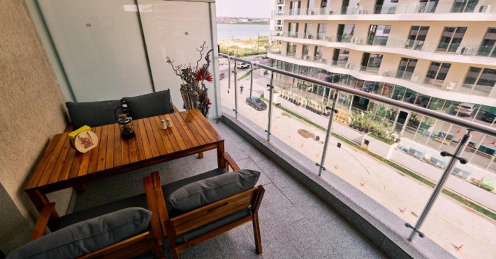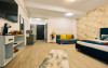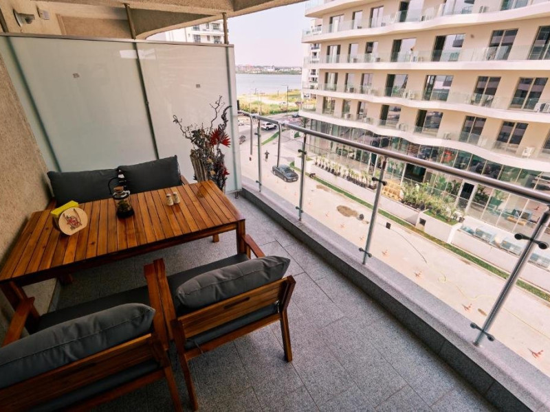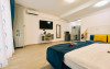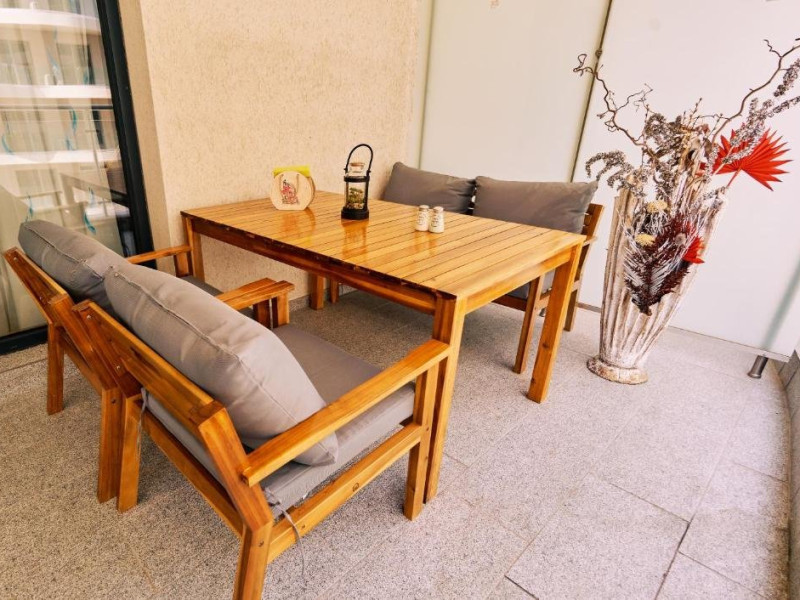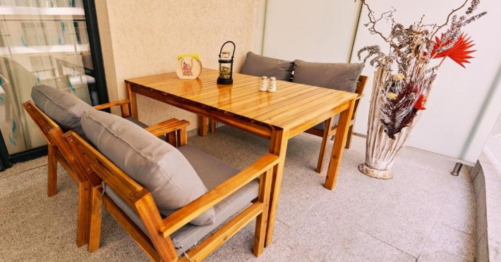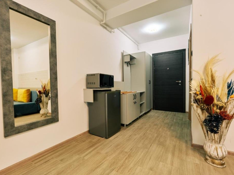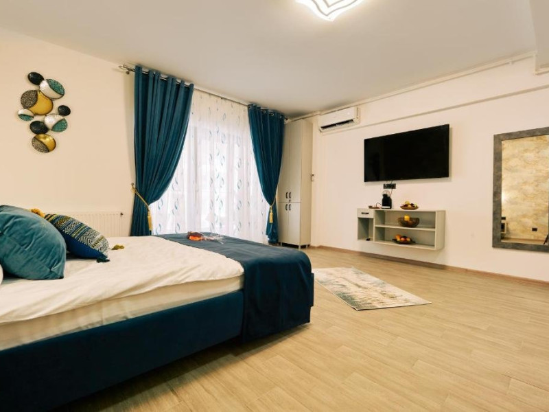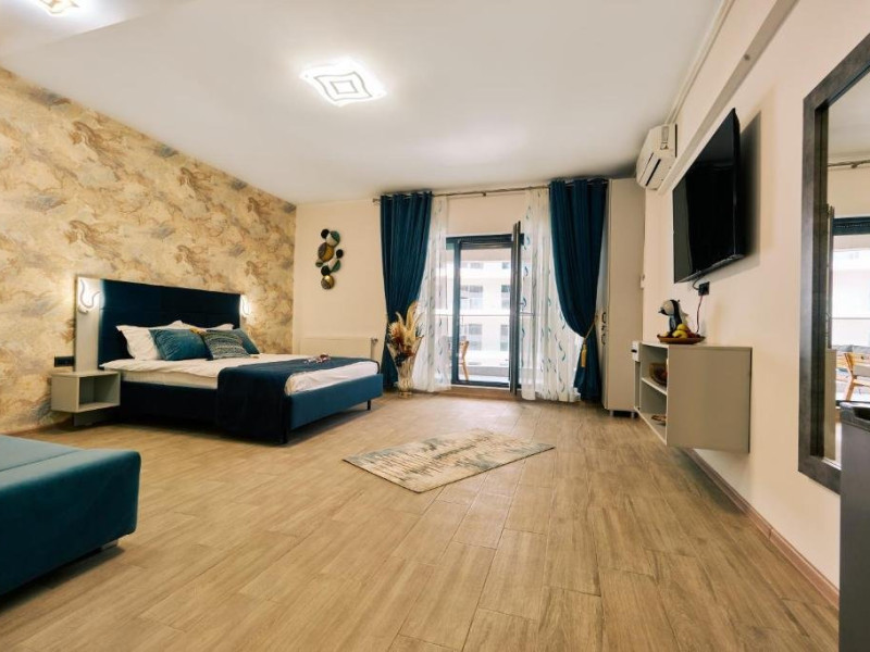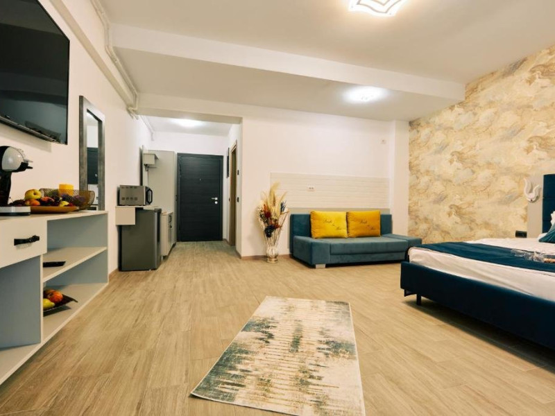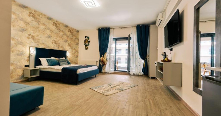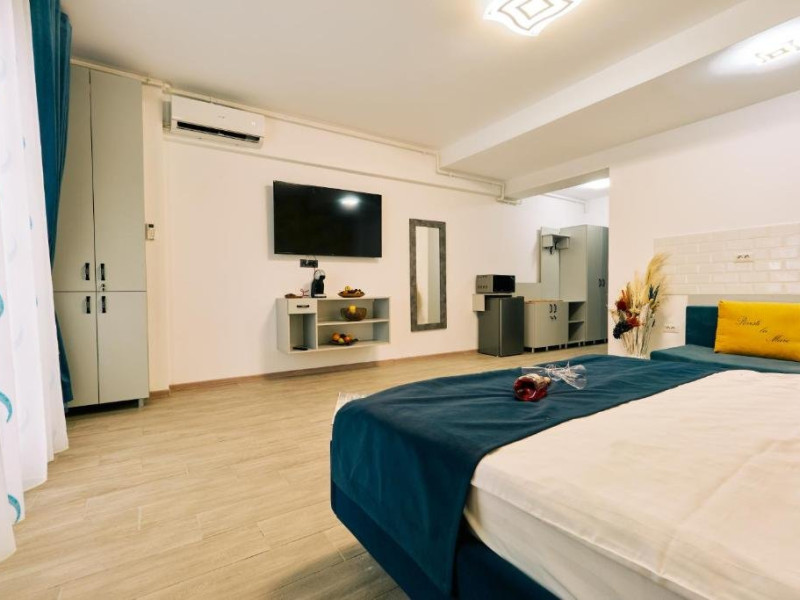 Camere: Toate studiourile beneficiaza de un pat matrimonial 180x200 cm, canapea extensibila 160x200cm, TV cu ecran plat,canale prin satelit Netflix, minibar, plasa de tantari, scaun inalt pentru copii, patut pentru infant, bucatarie utilata complet: cuptor cu microunde, frigider, cafetiera, vesela, etc., baie privata cu dus, uscator de par. Terasa in jur de 11mp, mobilier pentru exterior (masa, scaune, canapea).