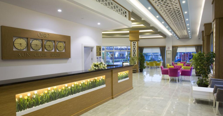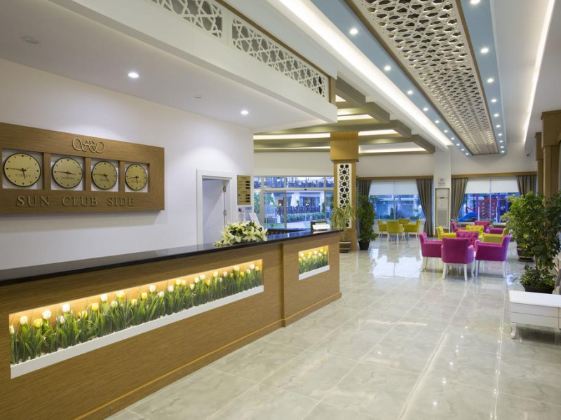 Amplasată în Side (Antalya), la 200 m de plaja Kumkoy, Sun Club Side este o proprietate de 4 stele care oferă o piscină în aer liber, terasă cu șezlonguri și umbrele de soare și unități de cazare cu aer condiționat. Facilitățile de la Sun Club Side includ și sală de fitness. Pentru petrecerea timpului liber oaspeții au la dispoziție activități de agrement pe timpul zilei și programe de divertisment seara. Proprietatea are, de asemenea, servicii de recepție cu program non - stop, concierge și închirieri auto. Se oferă acces gratuit la internet Wi-fi în spațiile publice.