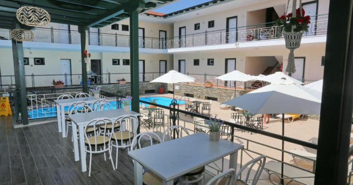 Hotel Sun pune la dispozitia turistilor curte exterioara, bar, dar si o piscina cu sezlonguri si umbrele pentru turisti.