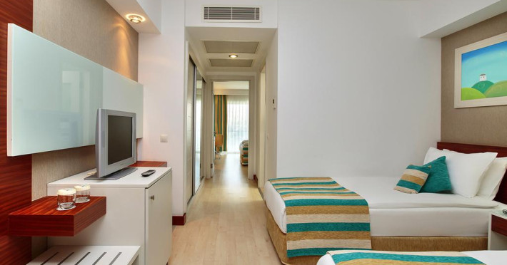 Toate camerele de la Evren Beach Resort Hotel & Spa sunt dotate cu televizor LCD cu satelit, aer conditionat (centralizat), balcon si baie privata cu cada sau dus, uscator de par si oglinda cosmetica. Fiecare camera include minibar (umplut o data pe zi cu bauturi non-alcoolice), cana electrica cu set pentru ceai si cafea, precum si seif electronic.