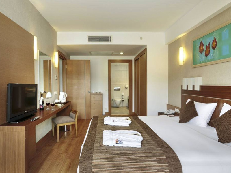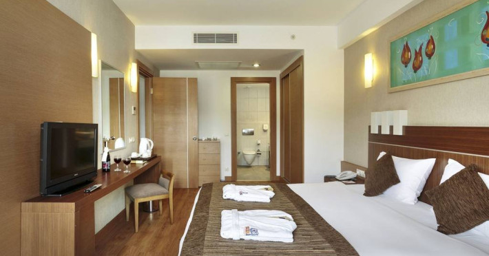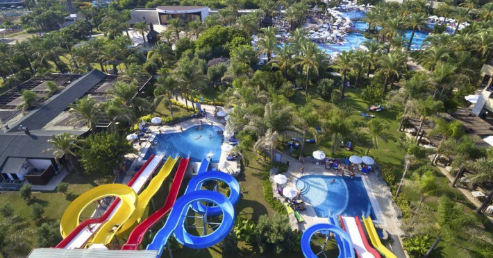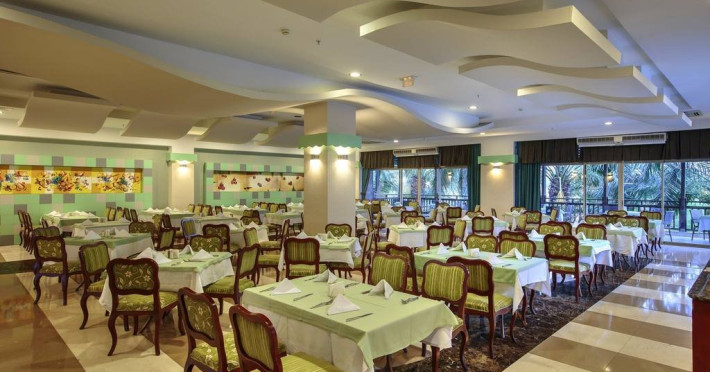 Facilitati hotel: Hotelul ofera oaspetilor sai multiple facilitati: restaurant principal, 6 restaurante a la carte (italian, asiatic, pescaresc, mexican, grill, turcesc), patiserie, baruri si cafenele, discoteca, piscina interioara, piscine exterioare, piscina cu tobogane pentru adulti si copii, centru fitness, baie turceasca, sauna, tenis de masa, terenuri de tenis, darts, volei pe plaja, cinema, animatie, mini club, junior club, loc de joaca pentru copii, baby sitting, bufet pentru copii la cina.