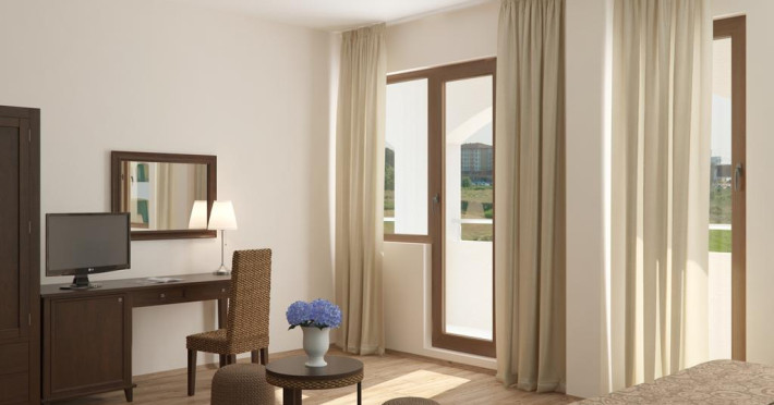 Complexul are camere duble (26mp), apartamente cu 1 dormitor (63mp), apartamente cu 2 dormitoare (90mp). Camerele duble au fie 2 paturi twin, fie un pat matrimonial, aer condiționat, TV satelit, telefon, minibar, seif (contra cost), Wi-Fi (contra cost), aparat pentru prepararea de ceai/cafea, baie cu dus, uscător de păr. Patul extra poate fi pat de o persoană sau canapea extensibilă. Apartamentele sunt dotate cu baie cu duș sau cada, balcon, aer condiționat, telefon, TV satelit, seif (contra cost), Wi-Fi (contra cost), aparat pentru prepararea de ceai/cafea, minibar, farfurii, cuptor, mașină de spălat.