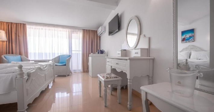 Apartamentul se compune din living cu canapea extensibila, un dormitor matrimonial (160x200), hol, baie cu cabina de dus, uscator de par si cosmetice hoteliere si balcon. Este dotat cu aparat de cafea, LCD tv, wi fi, aer conditionat, minibar, plase de tantari. Aer conditionat si Tv exista in amble camere, iar dormitorul dispune de usa. Suprafata 60 mp. Capacitate 2 adulti + 2 copii.