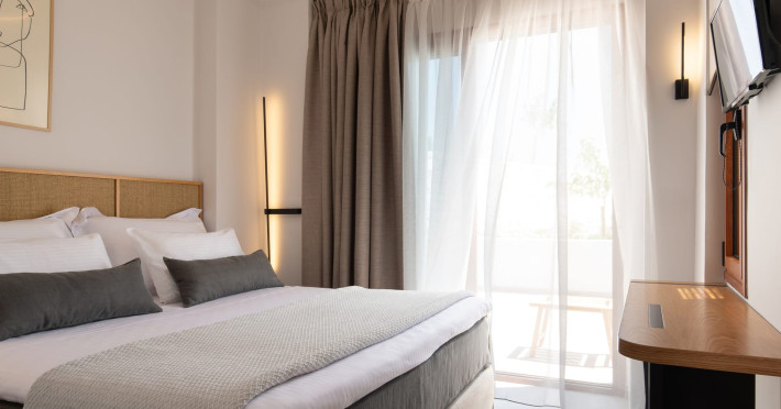 Each villa is self-contained with private parking. It has a bedroom with a King Size bed, a fully equipped kitchen, a living room with a sofa that becomes a bed and has direct access to the garden and the terrace with an unobstructed view of the sea. It has air conditioning in all areas and a flat TV in the bedroom and living room.