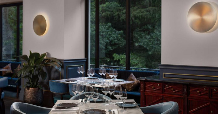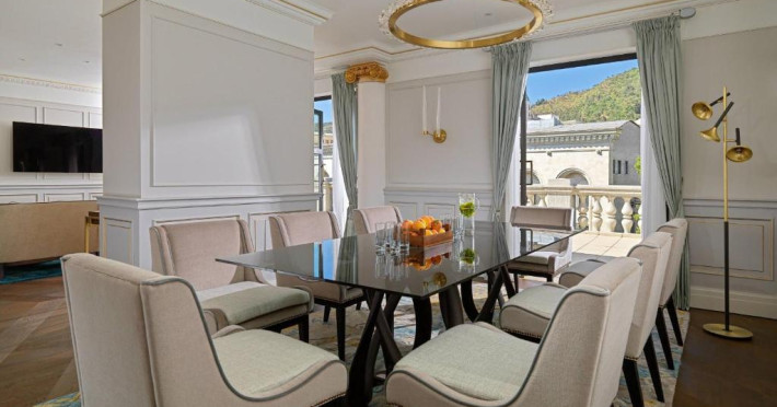 In Great Room, tavanul restaurat aduce un omagiu deschiderii hotelului din 1915. Podelele de marmură duc la Parnas Cafe, unde mesele in aer liber oferă locuri in primul rand pe Bulevardul Rustaveli. Bucurați-vă de preparate din carne maturată sau de un pahar de băutură la Majestic Cigar Lounge.