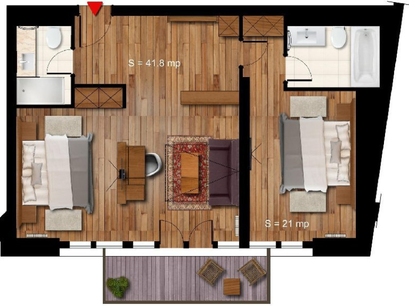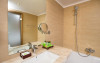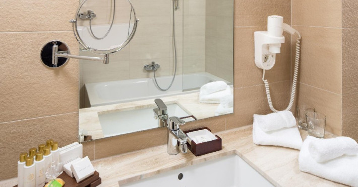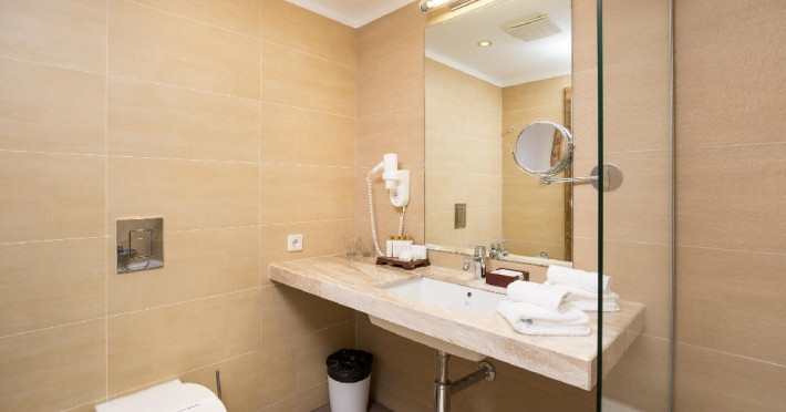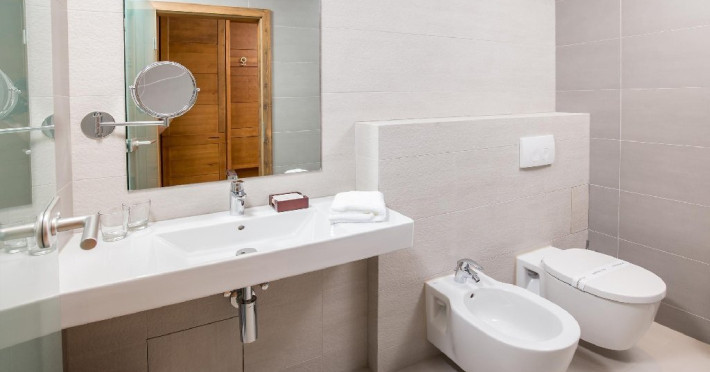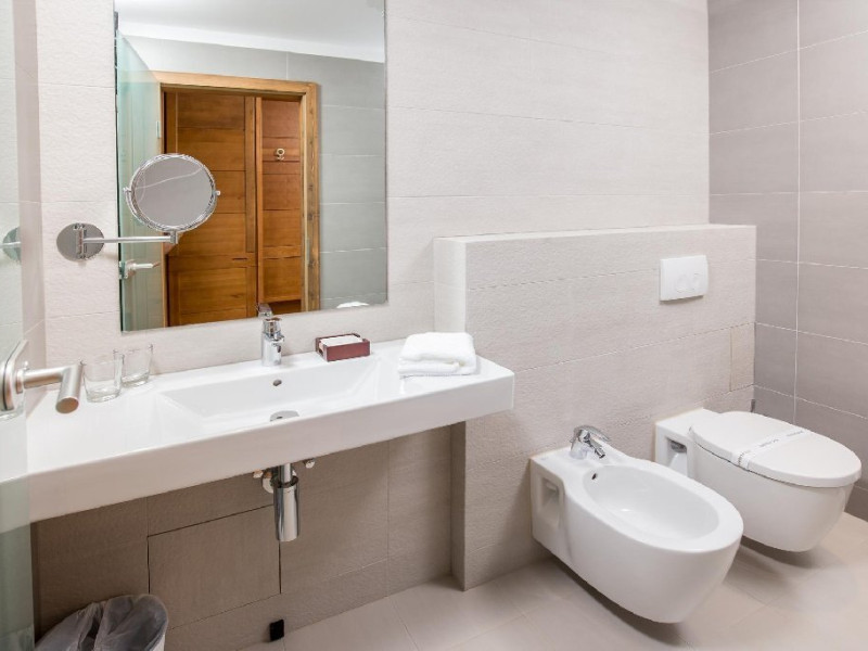 Exista doua camere de baie, una dotata cu cada, cabina de dus si lavoar, cea de-a doua cu vas de toaleta cu functie dubla (functie de bideu) si lavoar. Incalzirea in pardoseala, uscatorul de par, oglinda pentru cosmetica, halatul si papucii sunt doar cateva dintre elementele care definesc rafinamentul acestor camere.
