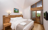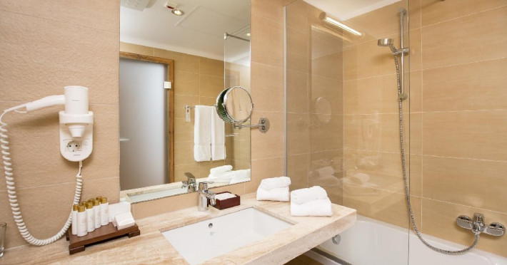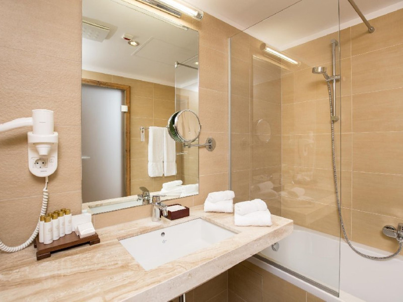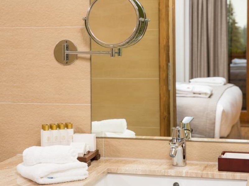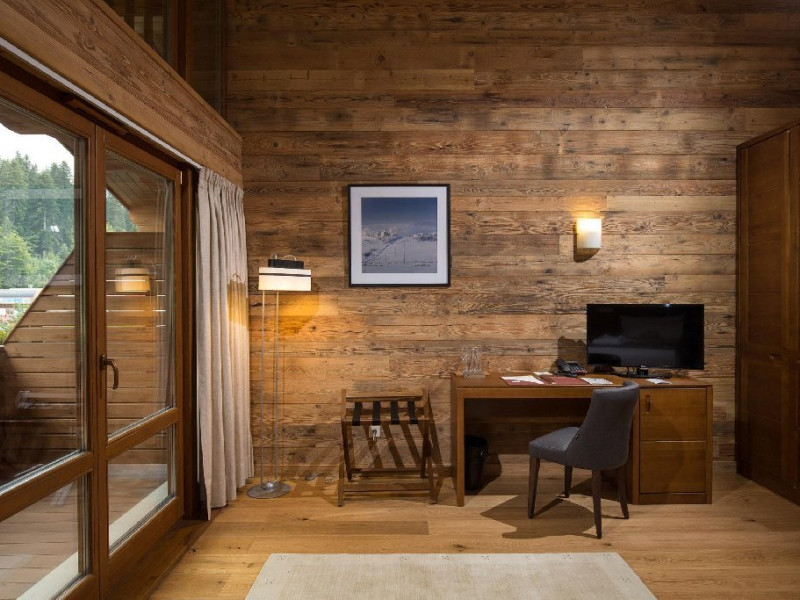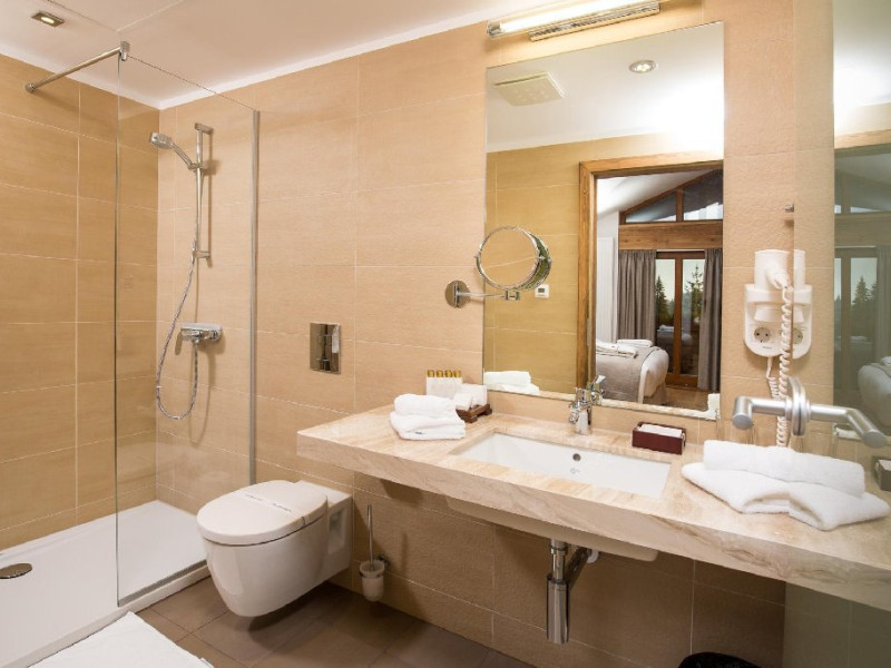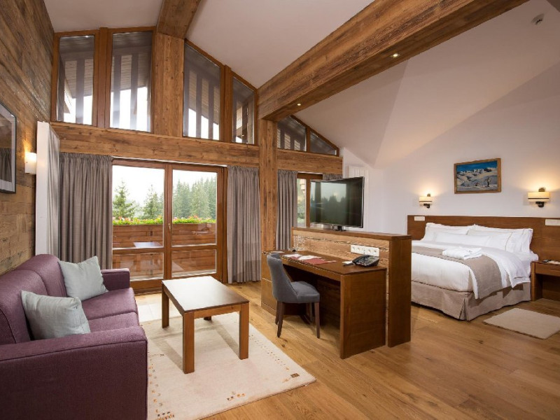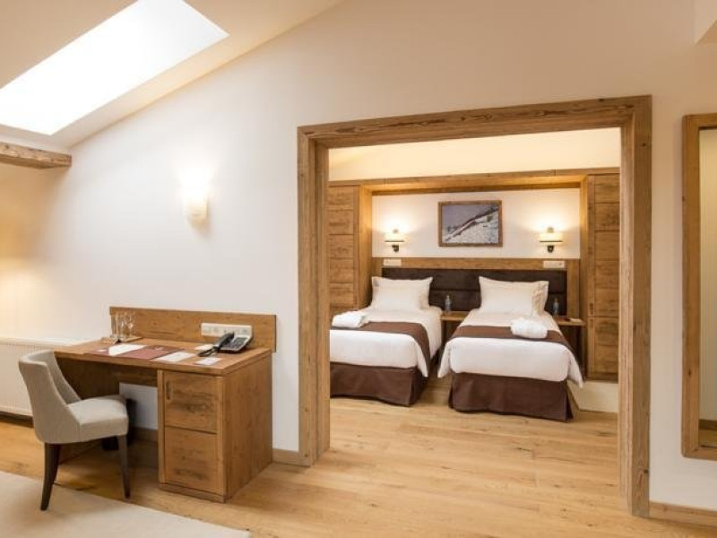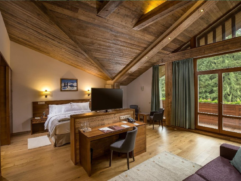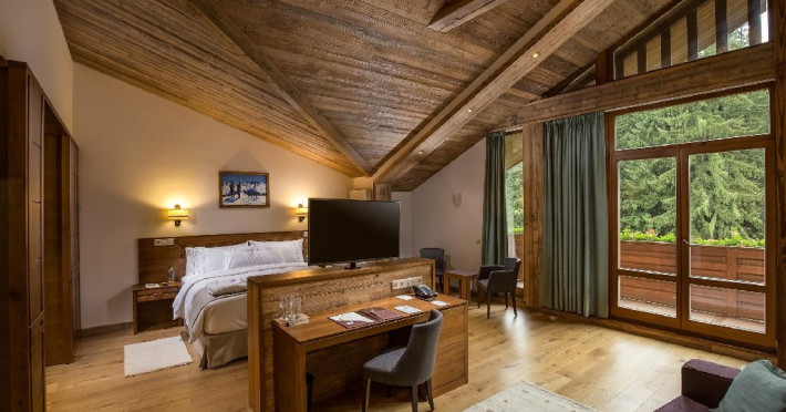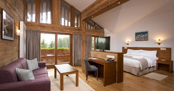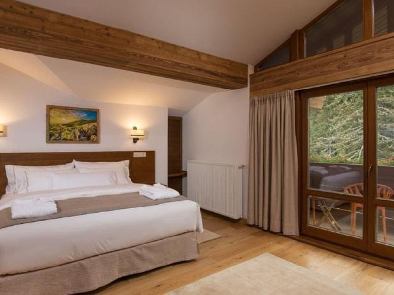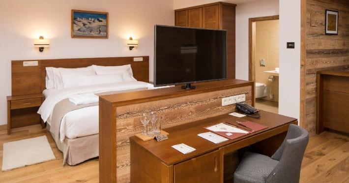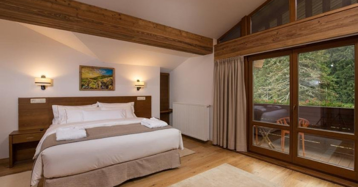 10 CAMERE DUBLE SUPERIOARE - 31 mp, Se poate opta pentru pat matrimonial sau paturi separate, camera beneficiind de urmatoarele dotari: birou, TV, telefon, seif, minibar, conexiune wireless la internet gratuita si control individual al temperaturii in camera. Camera de baie are cada sau cabina de dus, uscator de par, oglinda pentru cosmetica, halat de baie, papuci si o atmosfera de relaxare minunata. Balconul spatioasei camere ofera o imagine montana de vis.
