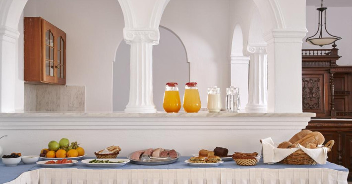 Terra Blue servește zilnic un mic dejun tip bufet în zona de luat masa. La proprietate există un snack-bar care oferă cafea, băuturi și gustări. Masa poate fi servită atât în interior, cît si în aer liber, pe terasă, în funcție de vreme.