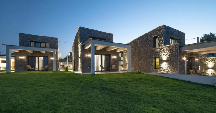 Cele 8 vile au 80 mp, au doua etaje si sunt potrivite pentru familii numeroase sau grupuri, deoarece pot gzdui confortabil 4 adulti si 2 copii sau 5 adulti. Etajul superior are un dormitor cu un pat dublu si baie cu dus. Parterul are un dormitor cu doua paturi de o persoana, o baie cu dus si o camer de zi cu o canapea extensibila, masa si bucatarie complet utilata cu placi electrice si frigider. Vila este confortabila si functionala, cu o estetica moderna, ideala pentru vizitatorii care cauta lux si calitate. La exteriorul fiecarei vile exista o zona frumoasa de relaxare cu sezlonguri in jurul piscinei pentru relaxare. Vederea padurii si a marii este uluitoare.