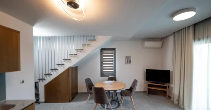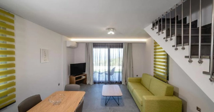 Cele 5 apartamente au 50 mp, au doua etaje si sunt ideale pentru familiile cu unul sau doi copii sau trei adulti. Etajul superior are un dormitor cu un pat dublu. Parterul are o camera de zi cu o canapea extensibila, mas, bucatarie complet echipat cu placi electrice si frigider. Apartamentele au un design modern si o vedere incredibila la mare, de care va puteti bucura stand in veranda.