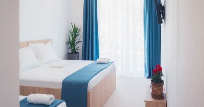 Apartamentul este un ansamblu compus din 1 dormitor cu pat matrimonial si un living cu o canapea extensibila si baie proprie, sistem de acces in camera pe baza de cartela/cod de acces, aer conditionat, TV LCD, seif, baie cu cabina de dus, cosmetice hoteliere, balcon cu mobilier. Apartamentul poate gazdui pana la 3 adulti, sau 2 adulti si 2 copii.