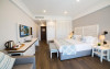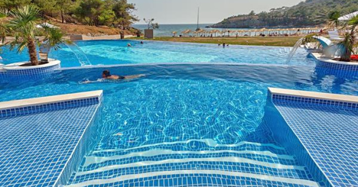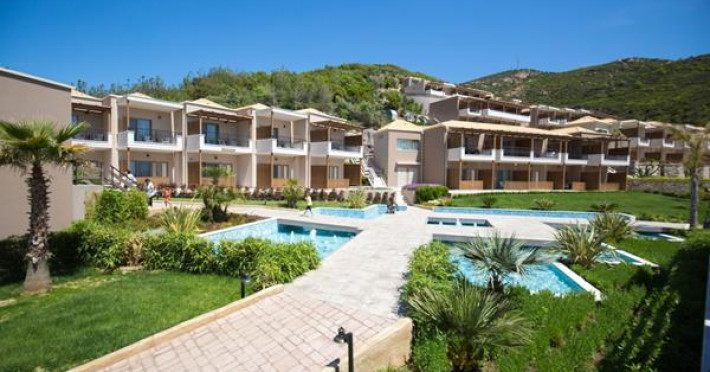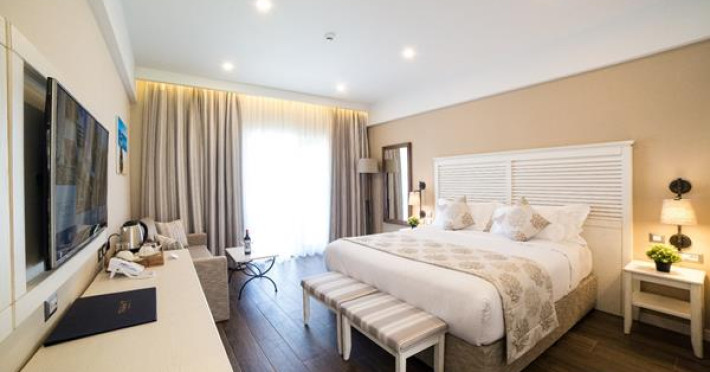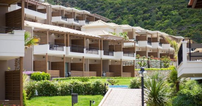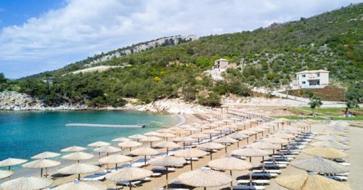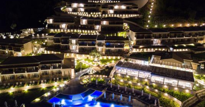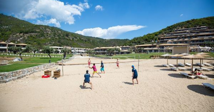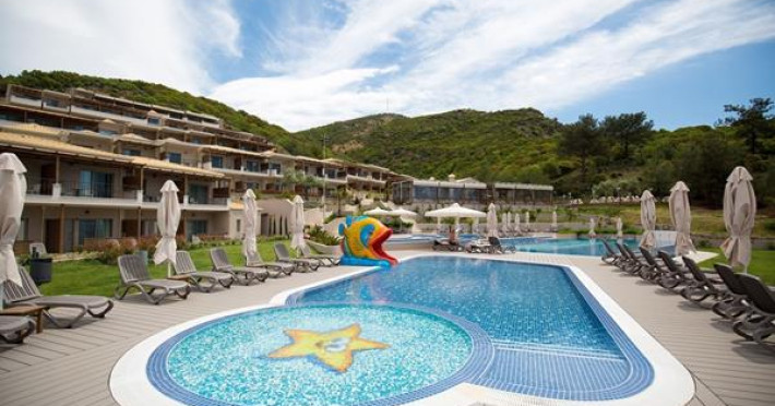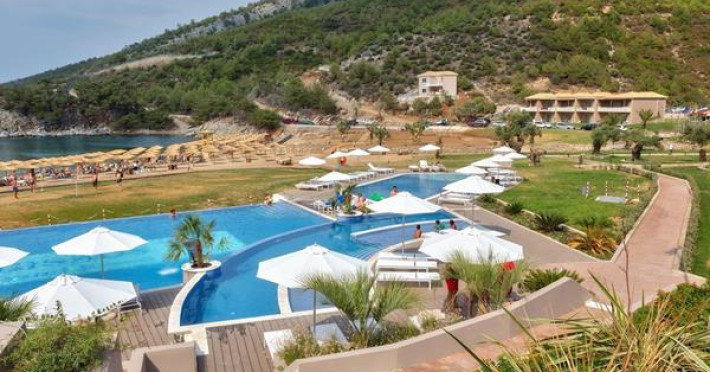 Thassos Grand Resort is a brand new luxury beachfront 5 star hotel on Thassos Island Greece. Tucked away in Agios Ioannis small bay in the southern part of the Island, the hotel has a private beach washed by the turquoise waters of the Aegean Sea, a century-old olive trees and offers a magnificent view of the sacred Mount Athos. The antiquity of the place is presented by ancient ruins more than 3000 years old. The distance to the ferry port of Limenas is 30 km. This luxury resort hotel is in a spectacular coastal location and it offers 161 rooms, 8 suites, 2 presidential suites and 2 villas with private pools situated in 14 buildings. All rooms and suites are equipped with a spectacular balcony facing the sea, the mountain or the garden, en-suite bathroom, the latest intelligent technology, state of the art flat screen TVs, wireless broadband Internet connection, free minibar and much, much more. The hotel has a main restaurant located in the main building, a tavern, bar, pool bar, beach bar, as well as the dine around option for guests on HB basis. The hotel offers also 2 outdoor pools, a main big one and a small one for children, as well as spa and wellness, parking and animation for children. Remarks: the superior sea view rooms are not situated right at the sea front, but due to the specific landscape of the bay, they offer a magnificent view towards the sea. The beach and pool front sea view rooms are located on the first line on the sea or pool front. The sunbeds are free of charge on the beach. The hotel offers as well rooms for disabled persons with easy and convenient access to all hotel facilities.