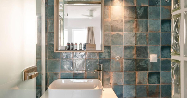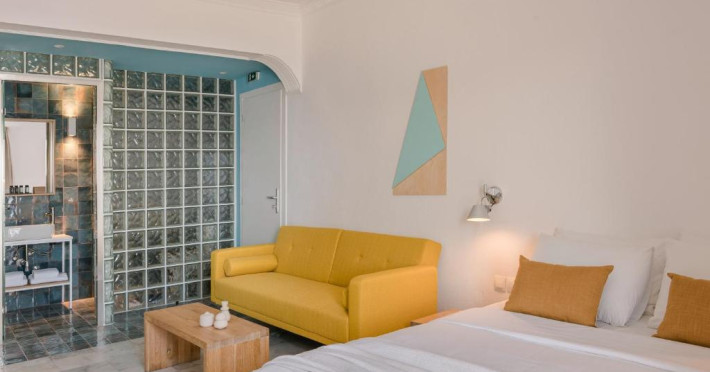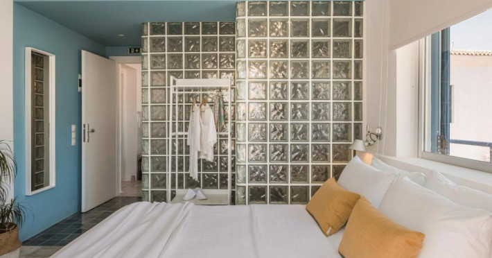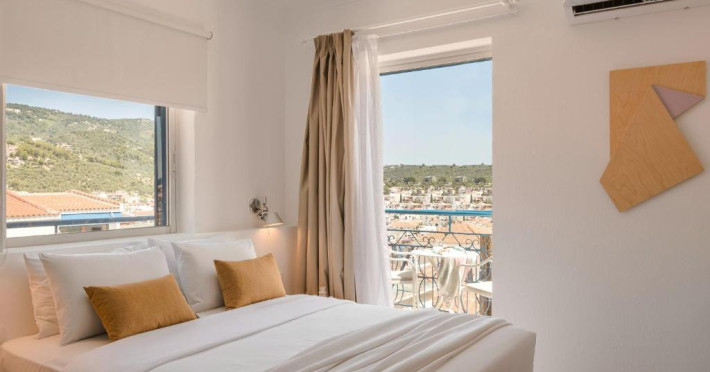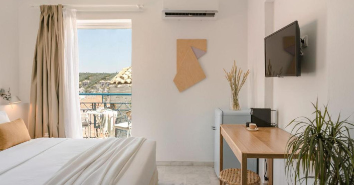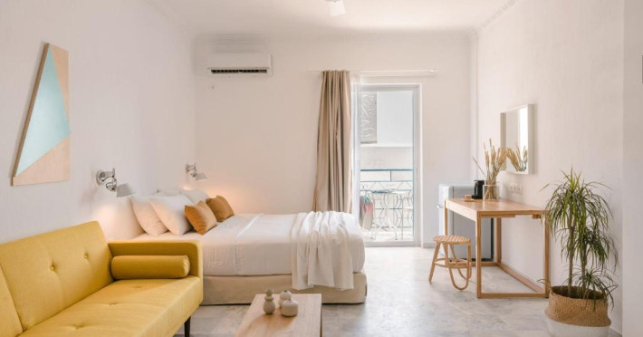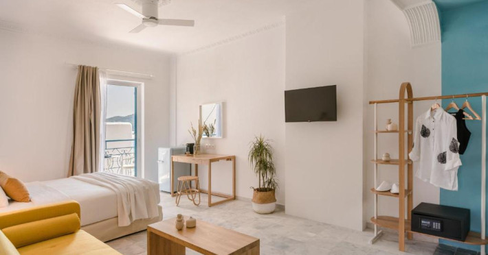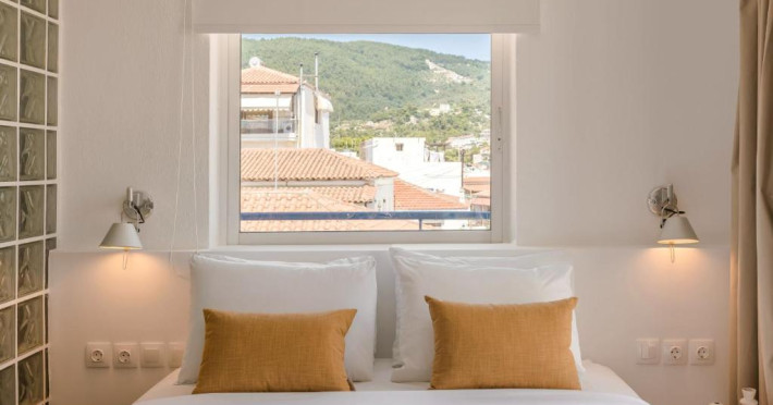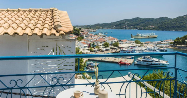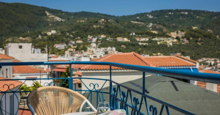 O proprietate recent renovată, The Blue este situată in orașul Skiathos, langă plaja Skiathos Plakes, plaja Megali Ammos și portul din Skiathos. Oferind vedere la mare și la oraș, această pensiune oferă și WiFi gratuit. Proprietatea oferă unități izolate fonic și este situată la 2,5 km de plaja Vassilias.