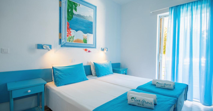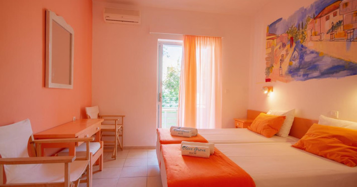 Built next to the long, sandy beach of Kavos, the Olive Grove Resort is located in the southern part of Corfu, and is ideal for precious moments of relaxation next to the sparkling blue waters of the Mediterranean Sea. All of our rooms are inspired by a different theme based on the island life, the sea, the sun and our local culture. Decorated in a unique touch with different colors and hand-made wall paintings, all rooms of the property have been elaborated by international artists from around the world and bring art in your own private space. Choose one of our boutique rooms, enjoy our wall art, rest and relax. Our rooms dispose of: • Views to the garden or pool• Private balcony• Free toiletries• Free WifiThe Resort has been planned having in mind all the needs of our guests; a swimming pool will relax you during the hot daytime, while you let yourself be delighted by the tastes of our pool bar-restaurant. Start your day with our delicious breakfast at our pool-bar or in your room, get through the heat of the day with our refreshing natural juices and salads, lay back till the late hours with the company of our dinner and fine wines. Guests will find a private parking on site with spacious parking places for individuals or groups. Since 2019, the Olive Grove Resort has launched a new Annex Building with Triple and Family Apartments, at a distance of 140 meters from the Main Building and the swimming pool, or 2 minutes walking. The Annex Building is an ideal option for groups of friends or families, as it offers apartments with 3 beds or family apartments with 2 bedrooms (4 beds). It is also a great solution for those looking for self-catering facilities during their holiday, as the entire Annex apartments dispose of kitchens or kitchenettes with cooking facilities. All guests of the Annex Building are entitled to use normally all of the facilities of the Olive Grove Resort for free (swimming pool, restaurant-bar, parking, reception services etc).Datorita dinamicitatii domeniului disponibilitatea ofertelor se modifica de la un moment la altul. De aceea ofertele sunt valabile in limita locurilor disponibile. Agentia nu este responsabila pentru eventualele neconcordante care pot aparea intre informatiile privind tarifele si alte detalii din site si informatiile primite in agentie. In aceste cazuri vor avea prioritate, intotdeauna, informatiile primite in agentie.