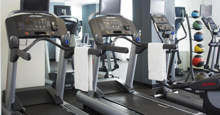 Floor-to-ceiling mirrors and mounted TVs are part of the on-site gym. Room service is available for lunch and dinner.
