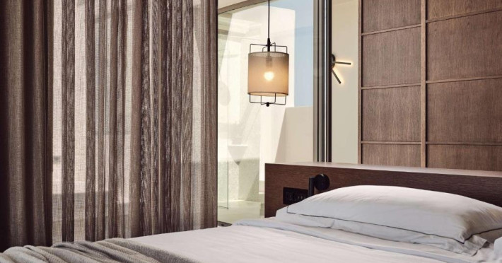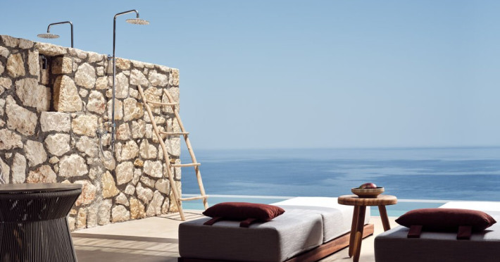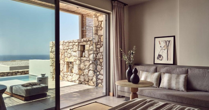Suita Elite cu piscina infinity privata si vedere la mare: aproximativ 47 mp, 1 dormitor separat si 1 living, maxim 2+2 persoane, plus piscina infinity privata cu sezlonguri.