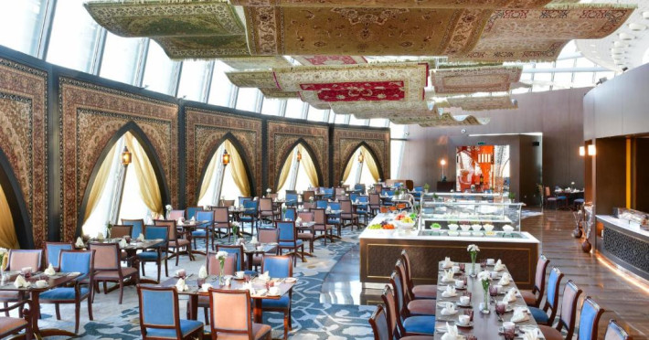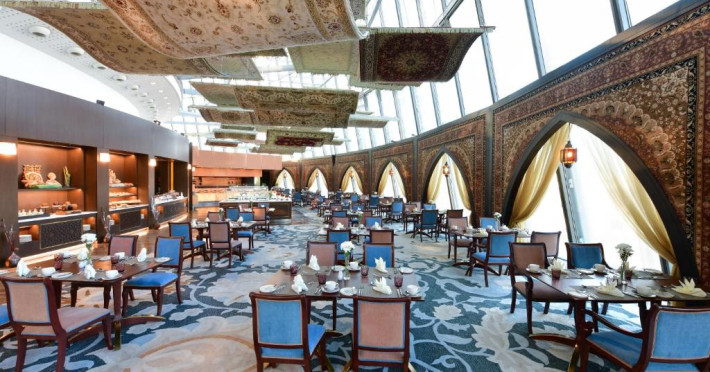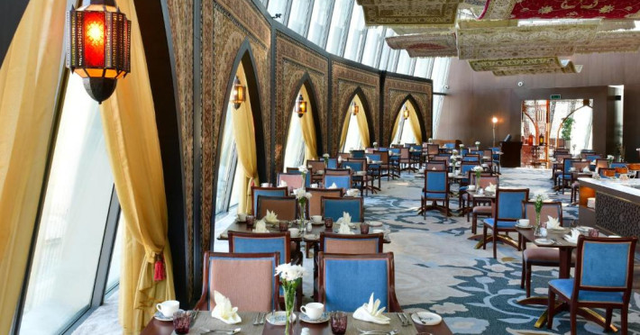 Micul dejun este servit zilnic la restaurantul Flying Carpet, cu decorul său șic, inclusiv covoare zburătoare. La cină, oaspeții pot savura paste italiene și carne mediteraneană.