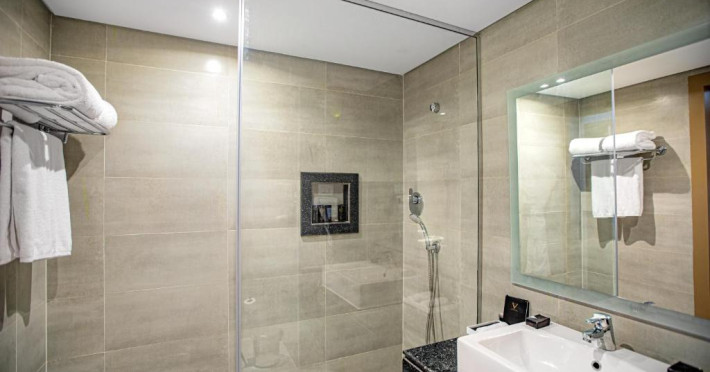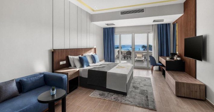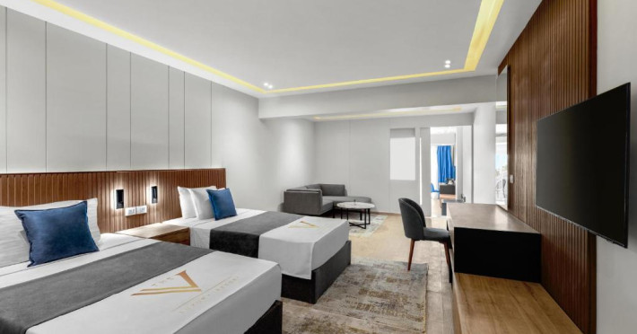 Camerele confortabile de la The V Luxury Resort au pardoseală de gresie/ marmură, aer condiționat și Tv cu canale prin satelit. Un minibar și o mașină pentru preparare cafea sau ceai se află în fiecare cameră. Oaspeții pot solicita serviciul de room service pentru a servi masa sau diverse băuturi. Oaspeții au acces gratuit la serviciul Wi-fi în camere. Camerele au balcon cu vedere la mare, la piscină sau la grădină. În camere există baie cu cadă sau duș prevăzută cu foehn. Curățenia in cameră se face zilnic.