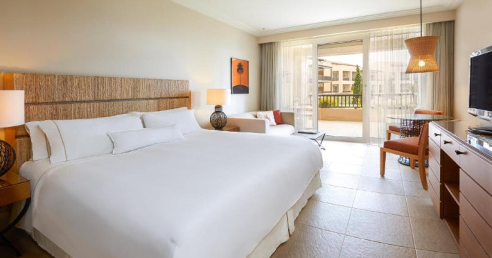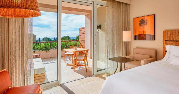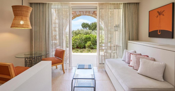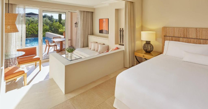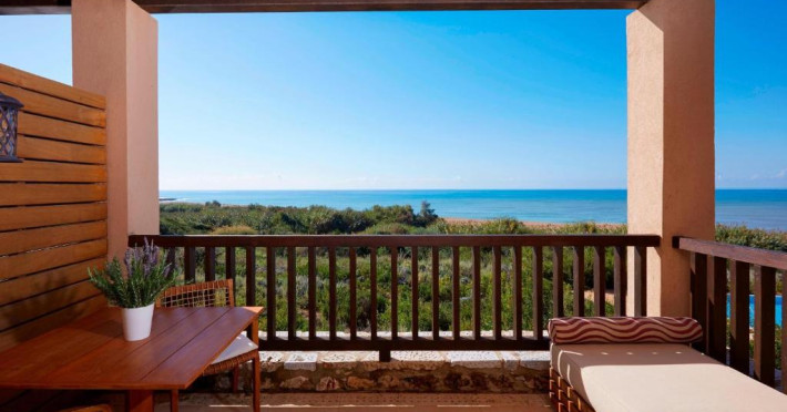 Camerele de la Costa Navarino sunt decorate cu mobilier modern, lemn de culoare deschisă și in nuanțele liniștite specifice mării și nisipului. Oferă balcon privat cu vedere la plantațiile de măslini și grădinile amenajate ale complexului.