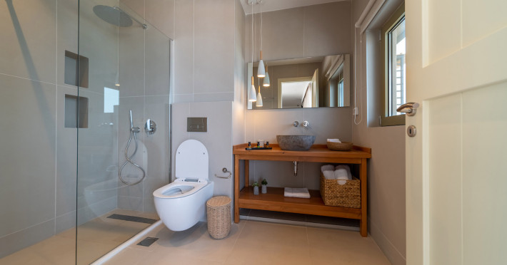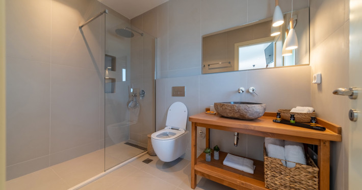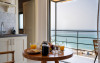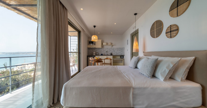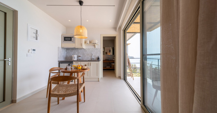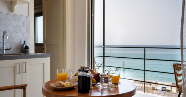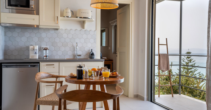 Each suite features an open-plan layout and modern kitchen with premium SMEG appliances, offering you the convenience to prepare small meals effortlessly. Indulge in a cup of coffee with the Nespresso Lattissima machine while enjoying entertainment on a 32-inch Samsung Smart LED TV. Relax on high-quality anatomical mattresses for a restful night’s sleep, complemented by centralized air conditioning for your comfort throughout your stay.The spacious bathroom is stocked with premium amenities, including slippers, a toothbrush and toothpaste, organic skincare products, and artisanal soaps sourced from “Kefalonia Soaps.”
