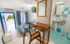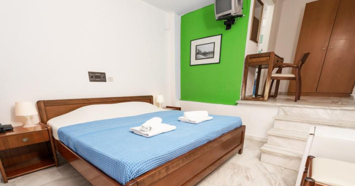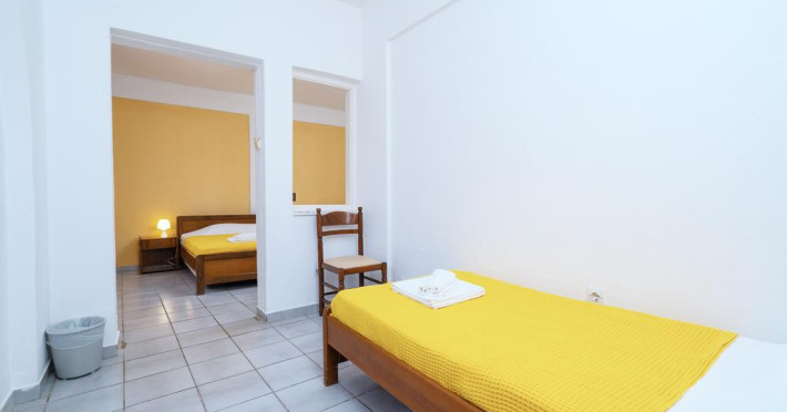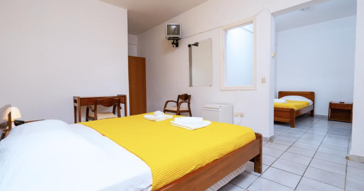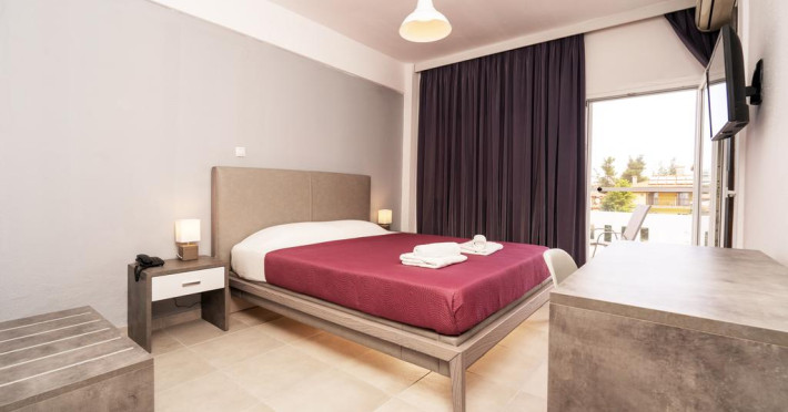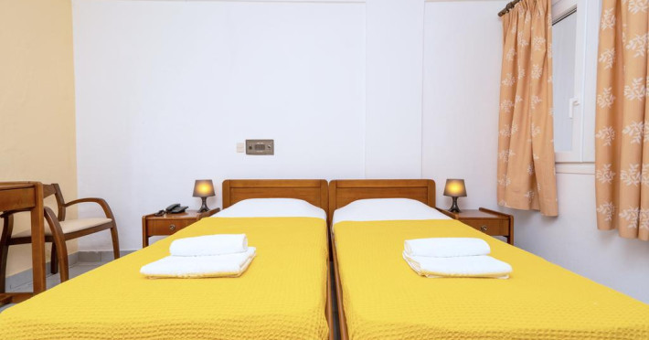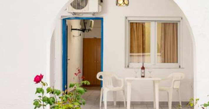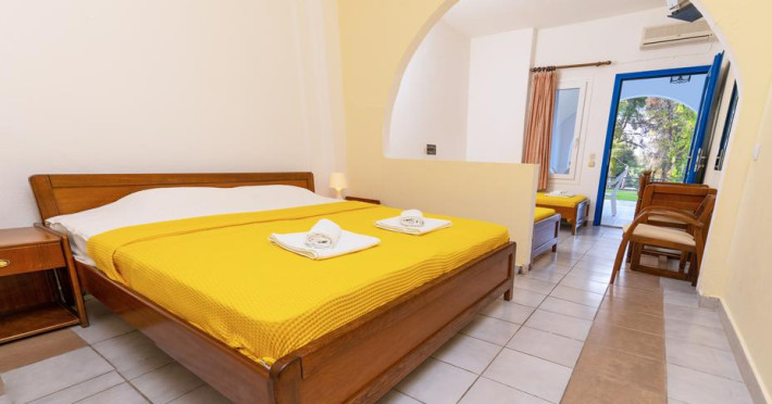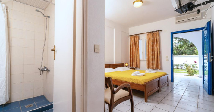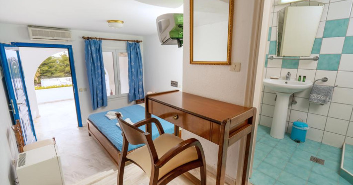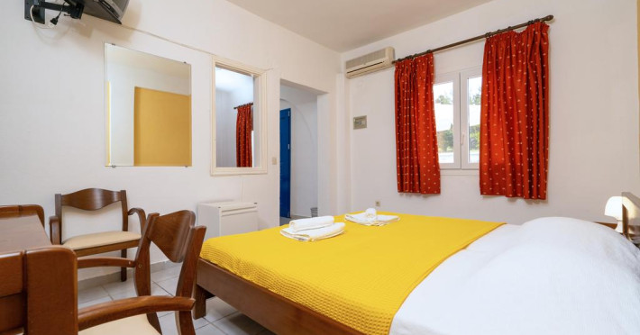 Sunt disponibile 40 camere. Unele camere au balcon cu vedere la mare sau la piscină. Camerele de la Theo Bungalows sunt dotate cu aer condiționat, Tv cu canale prin satelit și seif. În camere există baie cu cadă sau duș prevăzută cu foehn. Curățenia in cameră se face zilnic. Fiecare unitate de cazare are frigider. Proprietatea oferă camere pentru nefumători.