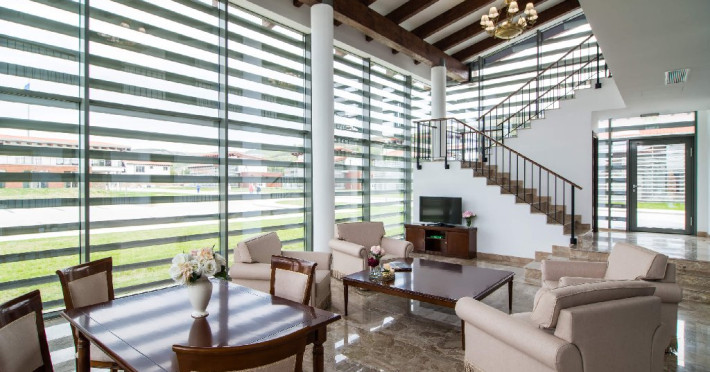 Mobilierul elegant, de lux, din lemn natural, pune accent pe crearea unui spatiu de odihna relaxant, securizat, configurabil direct de catre vizitator prin cardul sau privat, conectat la toate facilitatile camerei.