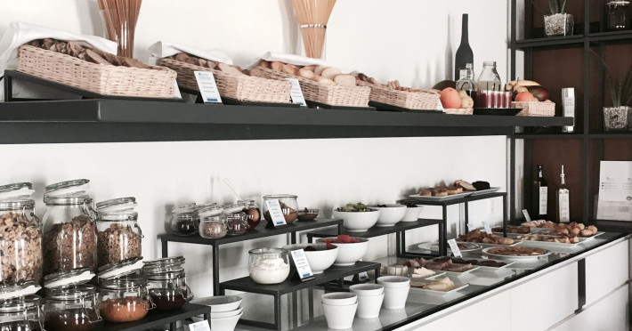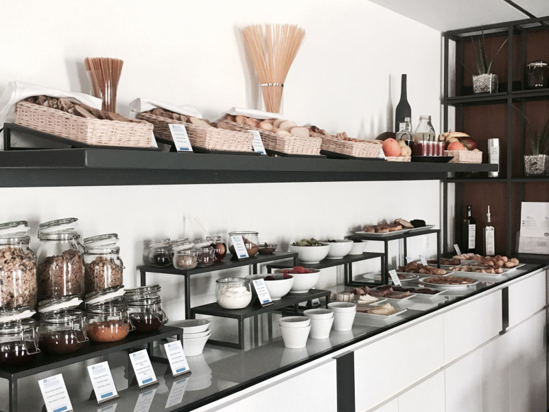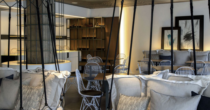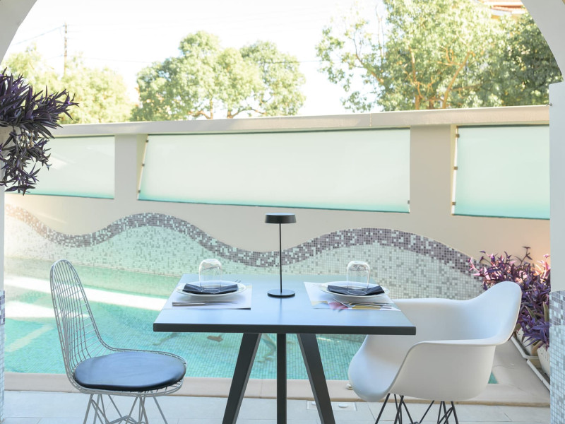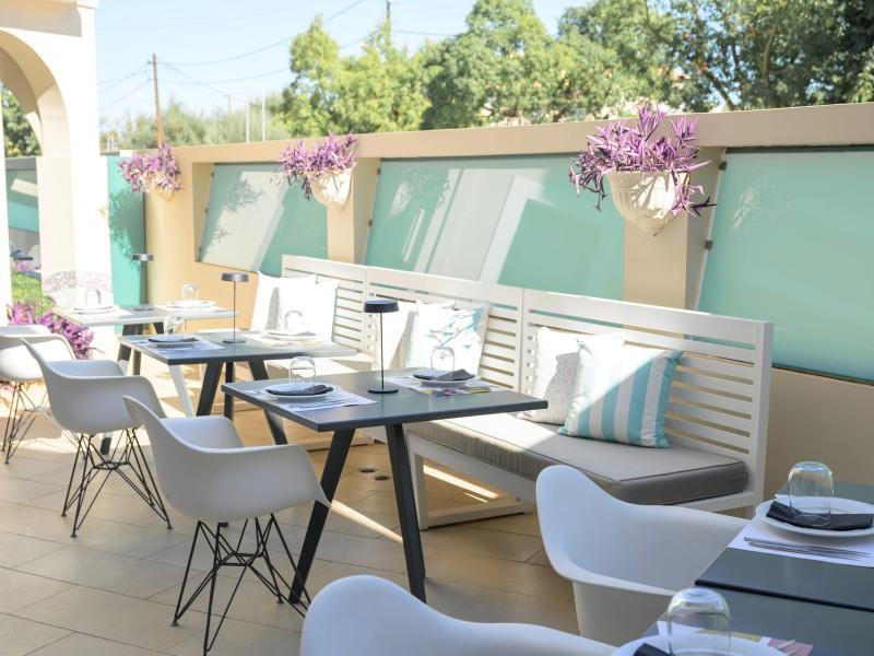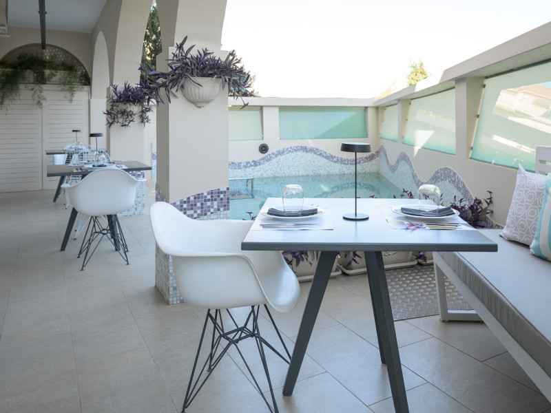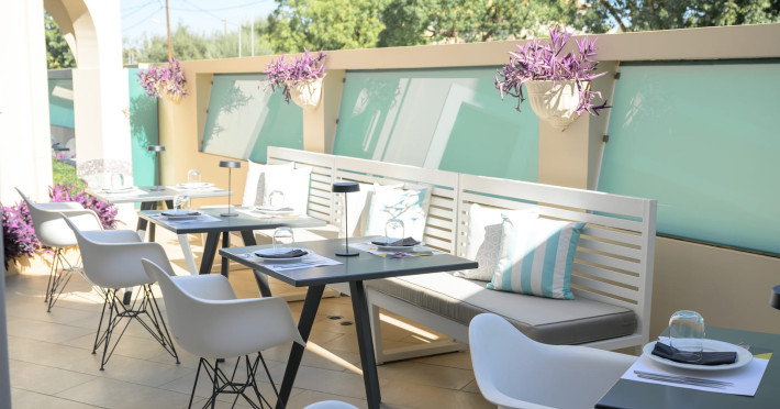 A wine restaurant a la carte is hosted at the garden and Aqua Gym area of Thomais Boutique Hotel that is open seasonally (from May to October). It serves not only hotel's guests but also every visitor of the island and provides Greek - Mediterranean cuisine with a modern approach. Our menu consists of a diversity of Greek local products and ingredients. In addition to this, a big variety of wines by Greek vineyard that are selected by sommelier, are served out by a coravin system. To be precise, coravin technology allows the guest to taste and enjoy a glass of wine from any bottle at any time.