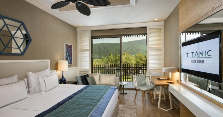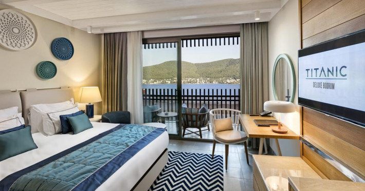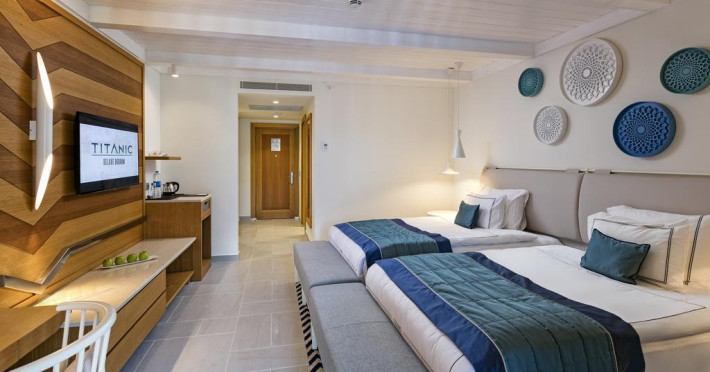 Camerele luminoase de la Titanic Deluxe Bodrum sunt dotate cu mochetă, aer condiționat, Tv cu canale prin satelit și seif. Fiecare cameră dispune de minibar și cană pentru preparare apă caldă. Unele camere au balcon cu vedere la mare. În camere există baie cu cadă sau duș ce are în dotare foehn și articole de toaletă gratuite. Oaspeții au acces gratuit la serviciul Wi-fi în camere. Curățenia in cameră se face zilnic. Proprietatea oferă camere pentru familie cu o suprafață mai mare și un număr mai mare de paturi față de cele standard. Se pot rezerva de asemenea camere pentru nefumători.