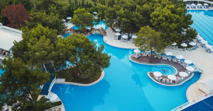 Restaurantul principal (oferă meniu dietetic, meniu vegetarian), 3 restaurante a la carte (italian, pescăresc, turcesc - cu rezervare, contra cost), 8 baruri (un bar cu program non-stop), 3 piscine exterioare (o piscină - olimpică cu 10 benzi), piscină interioară, 4 tobogane acvatice, cinema, centru SPA, coafor, lanț de magazine, spălătorie, curățătorie chimică, 12 săli de conferințe (10-1.200 persoane), un teren de fotbal pe teritoriul hotelului (54х92), 4 terenuri de fotbal la 3 km distanță de hotel (2 terenuri – 60х90, 2 terenuri – 105х68). Activități (gratuit): baie turcească, saună, baie de aburi, jacuzzi, sala de fitness, aerobic, aqua-aerobic, volei pe plajă, baschet, mini-fotbal, squash, 4 terenuri de tenis cu suprafață de tartan, tenis de masă, darts, tir cu arcul, sporturi acvatice fără motor, windsurfing (cu licență), program de animație, muzică live, discotecă. Contra cost: masaj, biliard, bowling (4 piste), aparate electronice, internet-café, fotbal de masă, închirierea echipamentului de tenis, nocturna terenului de tenis, cursuri de tenis, sporturi acvatice cu motor, cursuri de diving, internet wireless (pe întreg spațiul hotelului). Are plajă proprie, nisip, ponton. Bar pe plajă – gratuit. La piscină și pe plajă: umbrele, șezlonguri, saltele – gratuit. Prosoape pe plajă – cu garanție. Pentru copii: bufet,3 piscine, 4 tobogane, loc de joacă, mini club (4–12 ani), babysitter (contra cost), cărucior (contra cost).