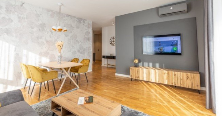 Oaspetii cazati in apartament beneficiaza de acces la o terasa si un loc de joaca pentru copii.