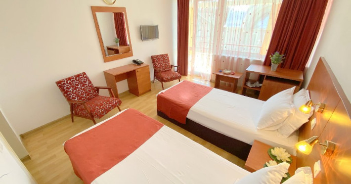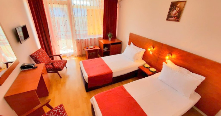 5) Camerele si apartamentele dispun de: TV LCD, mini racitor, A/C, bai cu dus.