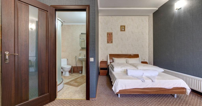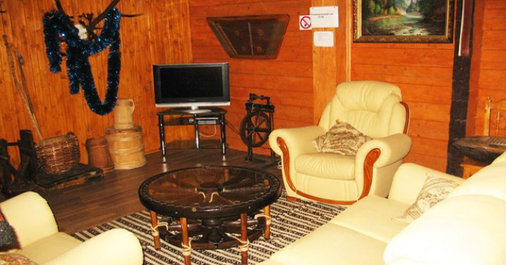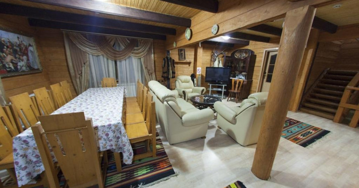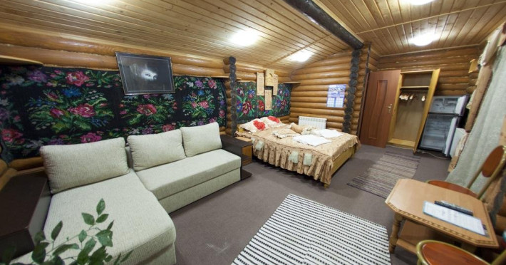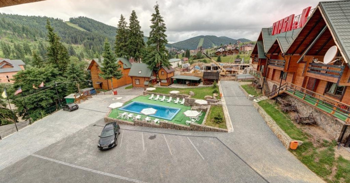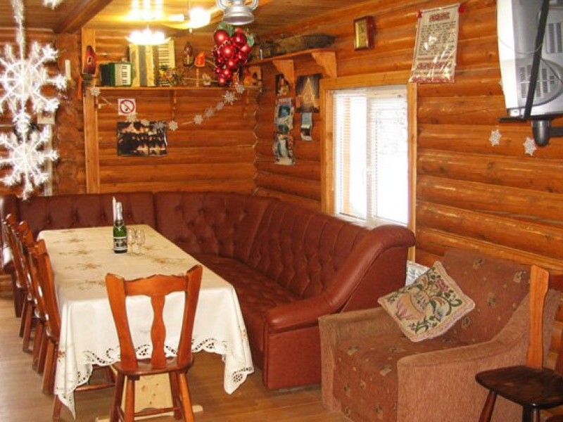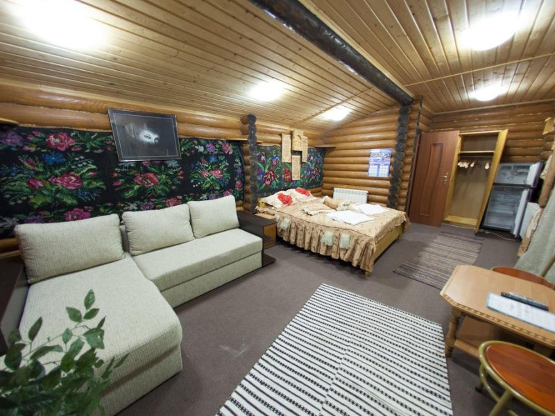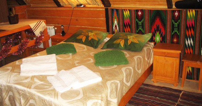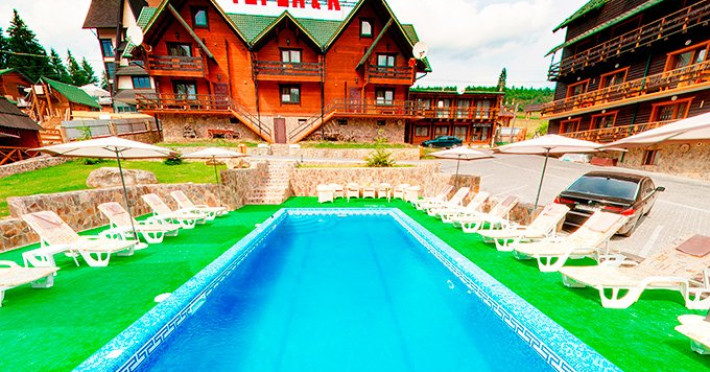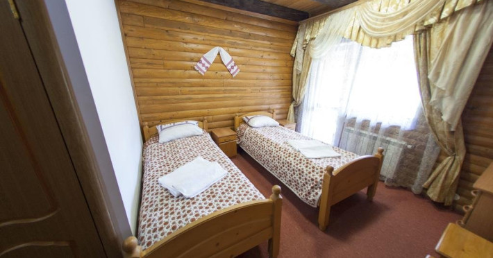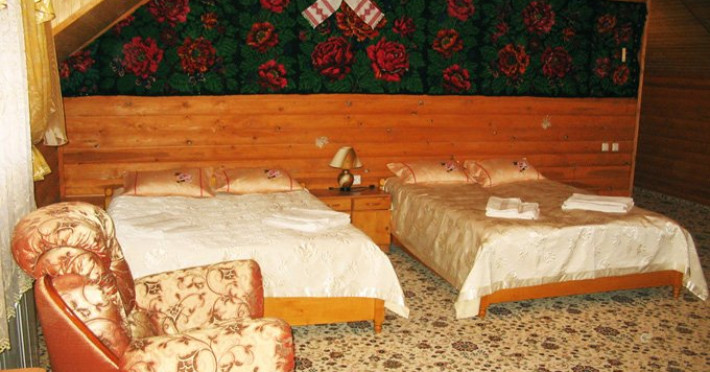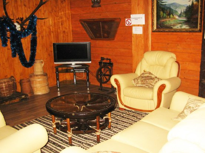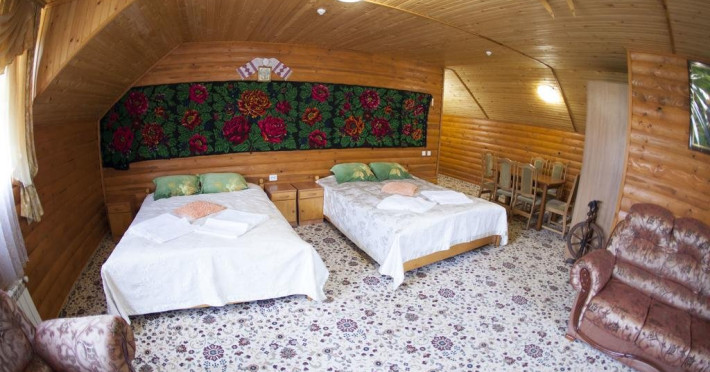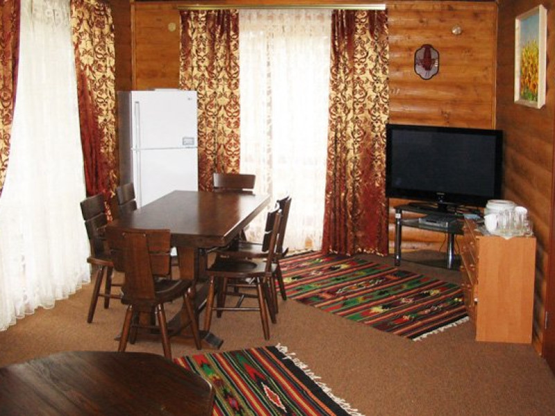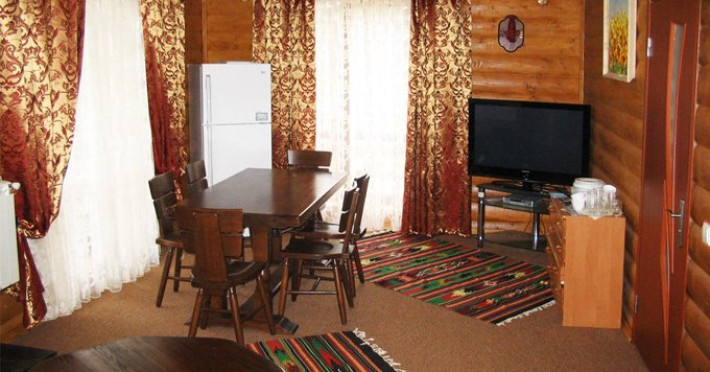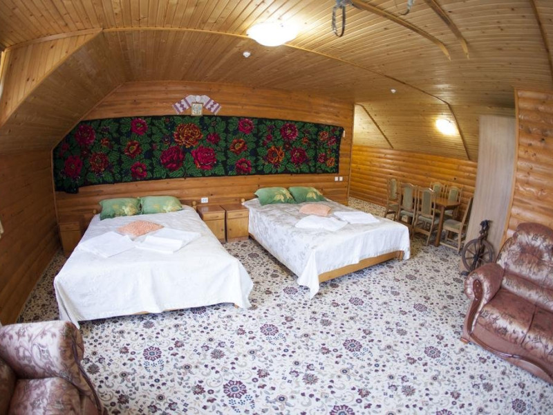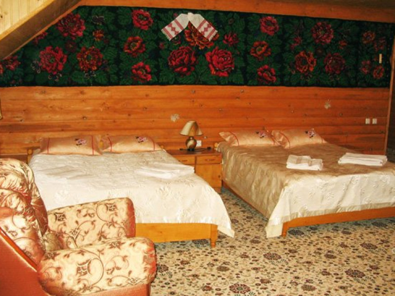- Cabanele cu trei etaje 'Torba' si 'Skrynia' ofera oaspetilor cate 12 de locuri: la primul etaj exista o camera dubla; la etajul al doilea exista 3 camere cu doua paturi, dintre care unul este cu paturi separate, iar altele cu paturi duble; la etajul 3 exista o camera de 4 locuri cu doua paturi duble; in fiecare camera exista o baie cu toaleta). La primul etaj exista un living mare decorat in stil hutsulian, care include o masa pentru 12 persoane, o bucatarie cu un bar, canapele, TV si artefacte de viata Hutsulian.