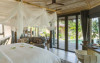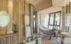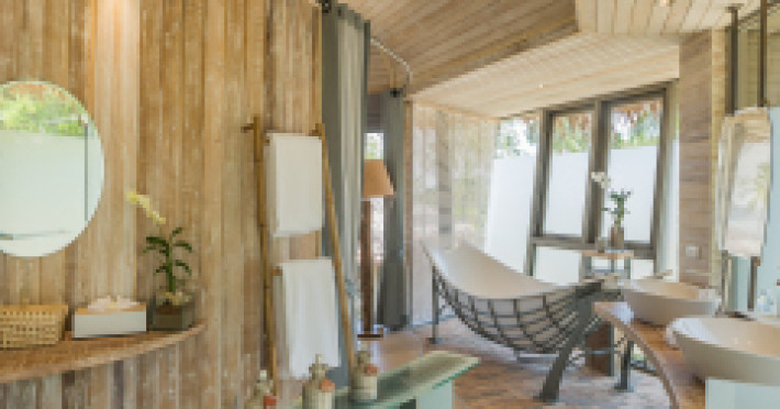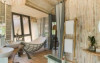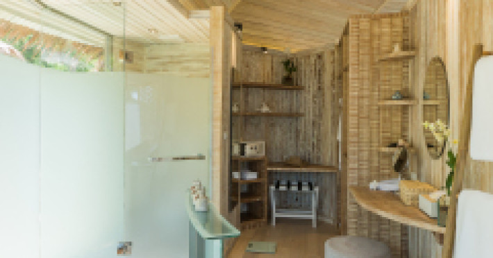 In the airconditioned upper floor, the grand king-sized bed faces a balcony which sits above the trees giving the feeling of floating over the leafy canopy and providing views over the sea to the Jurassic massifs of the bay. A large custom hammock-shaped bath, ‘jungle shower’ and changing room provide a delight to guests. A second personalized bar is set up with a selection of complimentary items and another day bed for further comfort and relaxation following the same colour and furniture scheme on the lower floor.