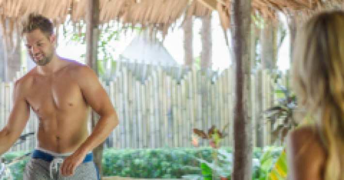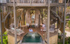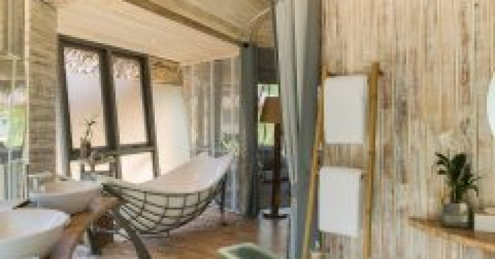The entry, over a suspended bridge, takes you into the signature TreeHouse Villa duplex arrangement. The lower floor is open-aired and features a plunge pool which reaches into the jungle itself. It comes complete with a private dining facility, personal bar with a selection of complimentary items, a double swing, day beds, and high ceilings all decorated in a European ‘shabby chic’ style using up-cycled and recycled materials and a colour palette inspired from the jungle and sea. An exceptional space for two.