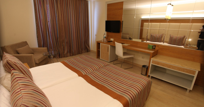 Sunt disponibile 468 camere. Fiecare cameră dispune de minibar. În camere există baie cu cadă sau duș prevăzută cu foehn. Camerele de la Pegasos Resort sunt dotate cu aer condiționat, Tv cu canale prin satelit și seif. Unele camere au balcon cu vedere la mare, unde oaspeții pot admira apusul sau răsăritul soarelui. Oaspeții au acces gratuit la serviciul Wi-fi în camere. Curățenia in cameră se face zilnic.