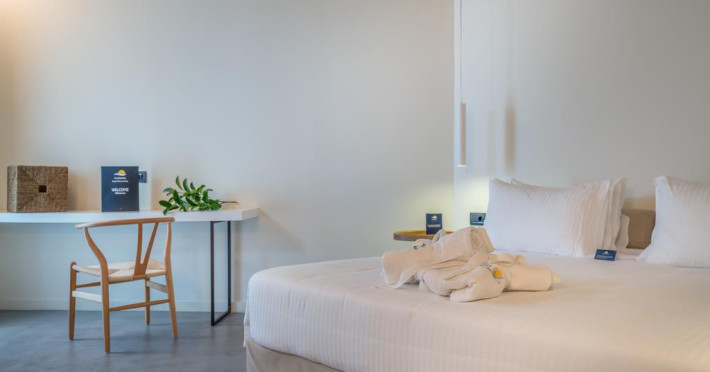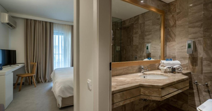 Sunt disponibile 164 camere. În camere există baie cu cadă sau duș prevăzută cu foehn. Unele camere au balcon cu vedere la mare sau la piscină. Oaspeții au la dispoziție serviciul de room service pentru a servi masa sau diverse băuturi. Camerele de la Caravel Suites sunt dotate cu aer condiționat, Tv cu canale prin satelit și seif. Oaspeții au acces gratuit la serviciul Wi-fi în camere. Curățenia in cameră se face zilnic. Proprietatea oferă camere pentru nefumători.