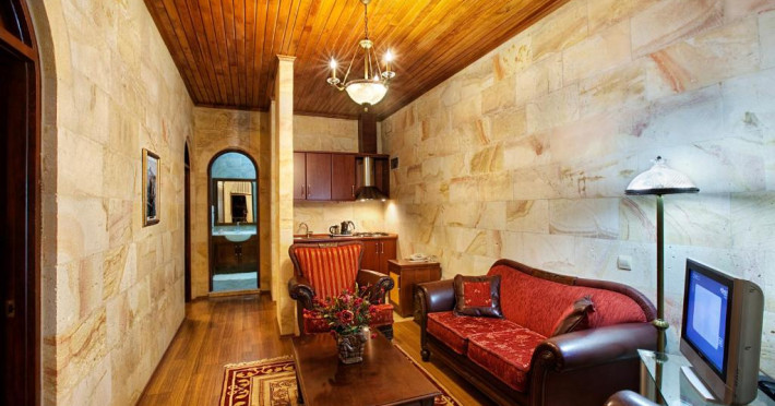 Camerele amenajate elegant de la Hotelul Uchisar Kaya au minibar si balcon. Acestea au baie privată cu articole de toaletă si uscător de păr.