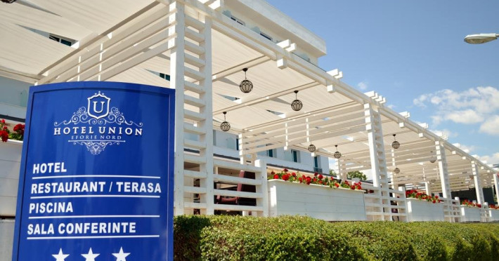 Localizare: Hotel Union 4**** Eforie Nord este situat pe faleza statiunii Eforie Nord, in zona centrala, in vecinatatea hotelurilor Acapulco si Diana.Descriere: Incepand cu anul 2022 hotelul dispune de un corp nou cu 69 de camere, totalizand astfel 169 de camere din care 69 dbl sup la 4****, 52 dbl VM 3*** 45 DBL Standard 3*** si 3 apartamente la 4****. Accesul pe etajele superioare se face cu doua lifturi panoramice.. Hotelul a fost complet renovat si modernizat in anul 2017 iar corpul nou a fost dat in folosinta in primavara anului 2022. Hotelul are bar, restaurant-terasa, piscina, loc de joaca ptr copii la plaja, sala de conferinta, lift, plaja privata, parcare - in limita locurilor disponibile